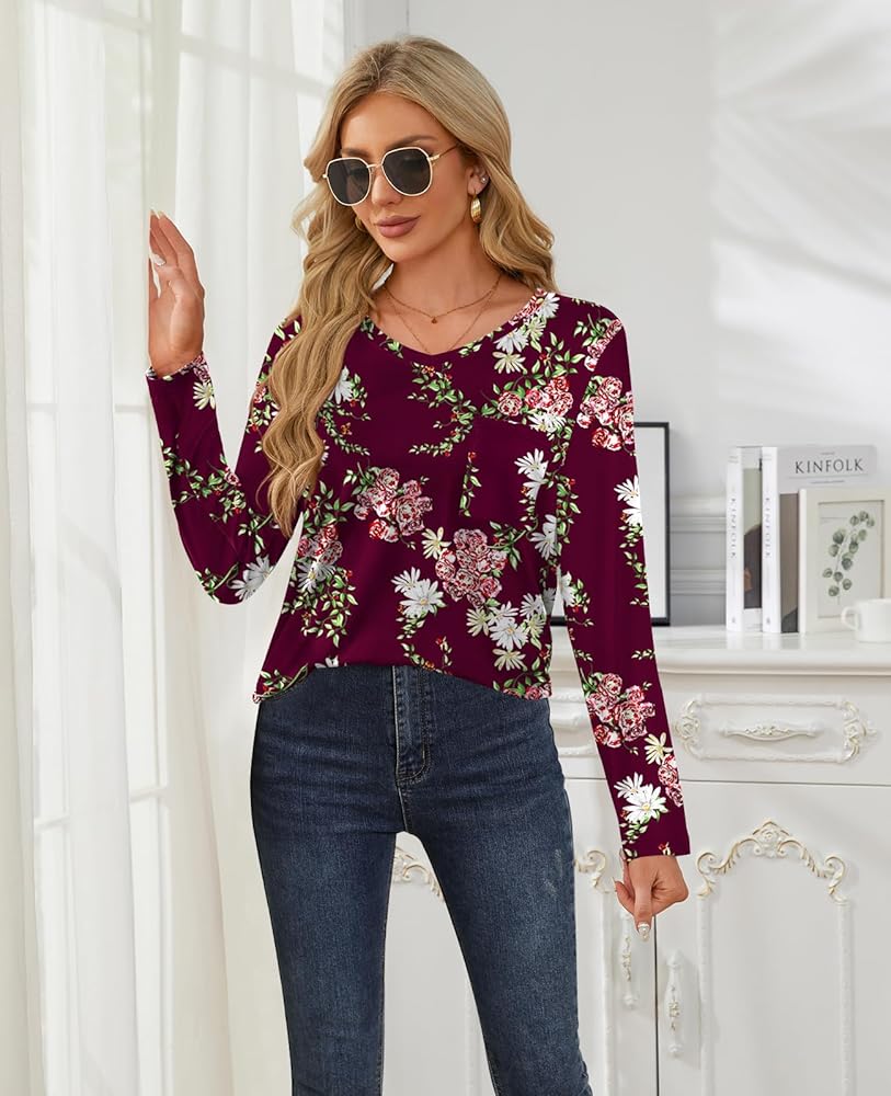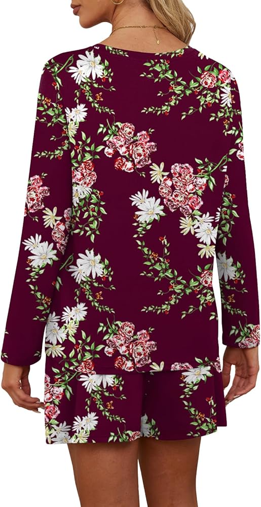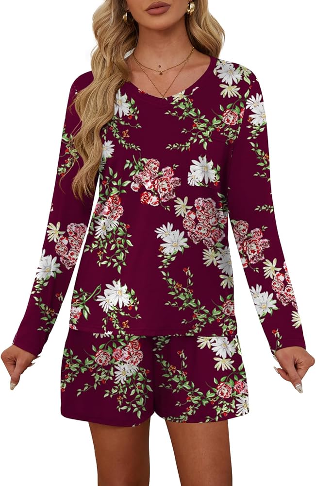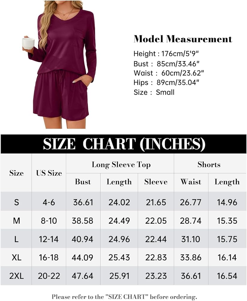 ❤ 【 Features 】 This casual loungewear includes a pullover shirt and matching shorts. The women's long-sleeve top features a classic V-neckline and a convenient pocket, while the shorts offer a soft elastic waistband with a drawstring and two side pockets.