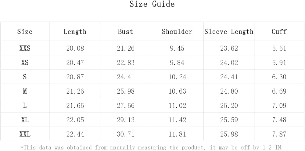 XL:Bust:29.1IN,Cuff:7.5IN,Length:22.0IN,Shoulder:11.4IN,Sleeve Length:25.6IN