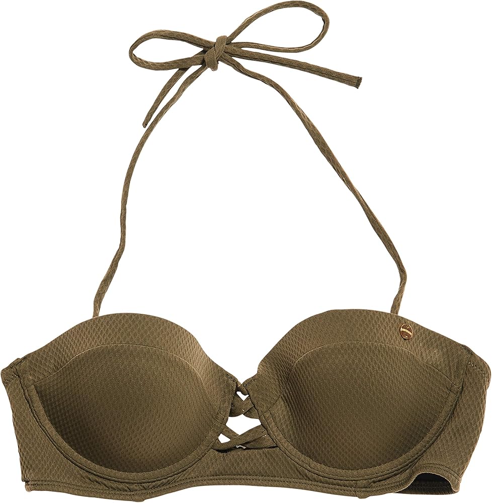 Superdry women's Sophia textured cup bikini top. This full cup bikini top has been designed in a textured material and has underwired support and is padded for a fuller cleavage. The bikini top features a halter-neck strap and can be clasped round the back. The Sophia textured cup bikini top is finished with a cut-out design at the front and a small, metal Superdry logo badge on one cup.