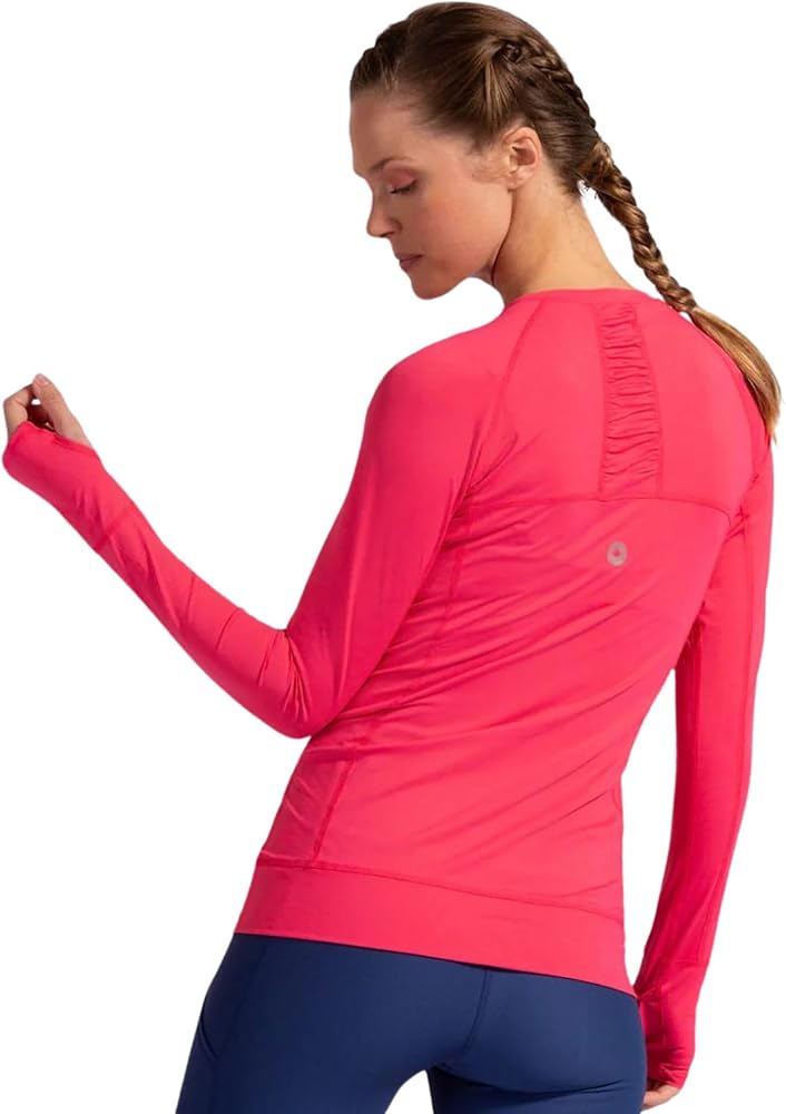 Long sleeve crew neck top, elongated sleeves to cover hands and rouching on the back, water or sweat cools off fabric- can be used for swimming