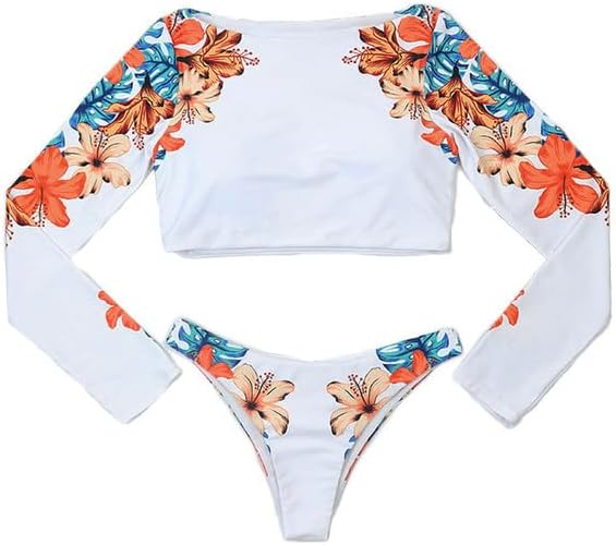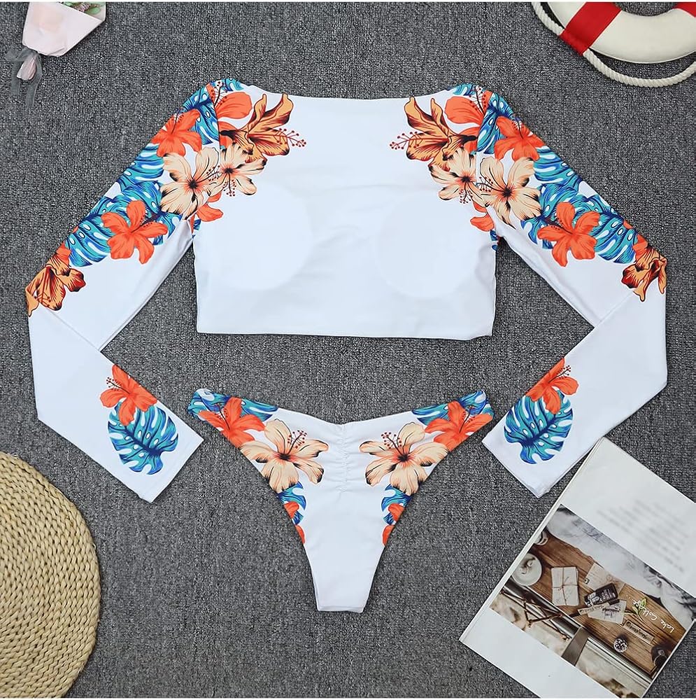 Design: Two-piece rash guard bathing suit for women. Removable wire-free bra. Long sleeves protect your skin from UV rays. Retro boat neck creates a elegant look, and makes the swimsuit easier to put on and take off. Crop top style can show your figure. High cut ruched back cheeky bikini bottom, more sexy and more flattering.