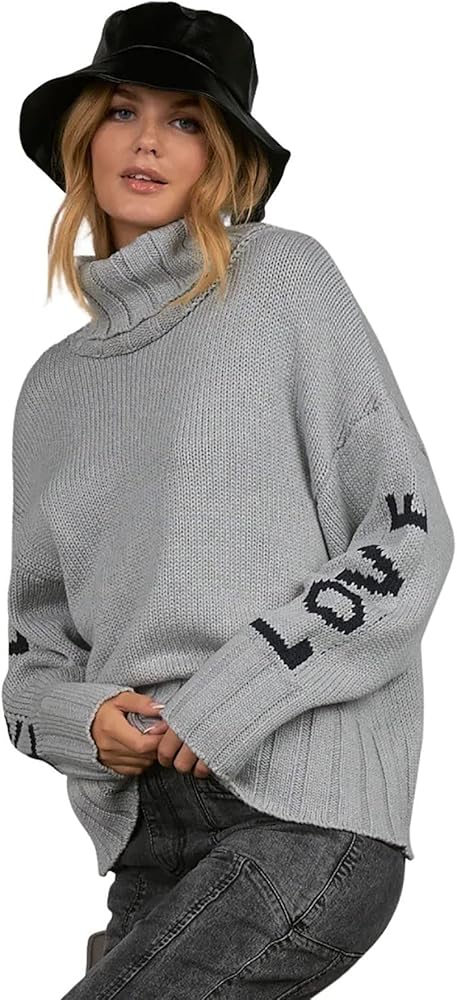 Smooth silky fabric, thick stitching and black 'LOVE' text down one sleeve and "FREE" down the other. This turtleneck sweater is both edgy and cute!