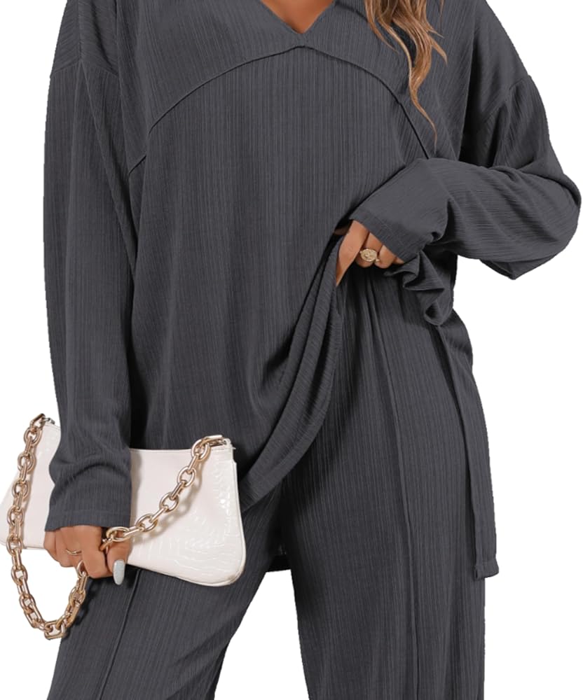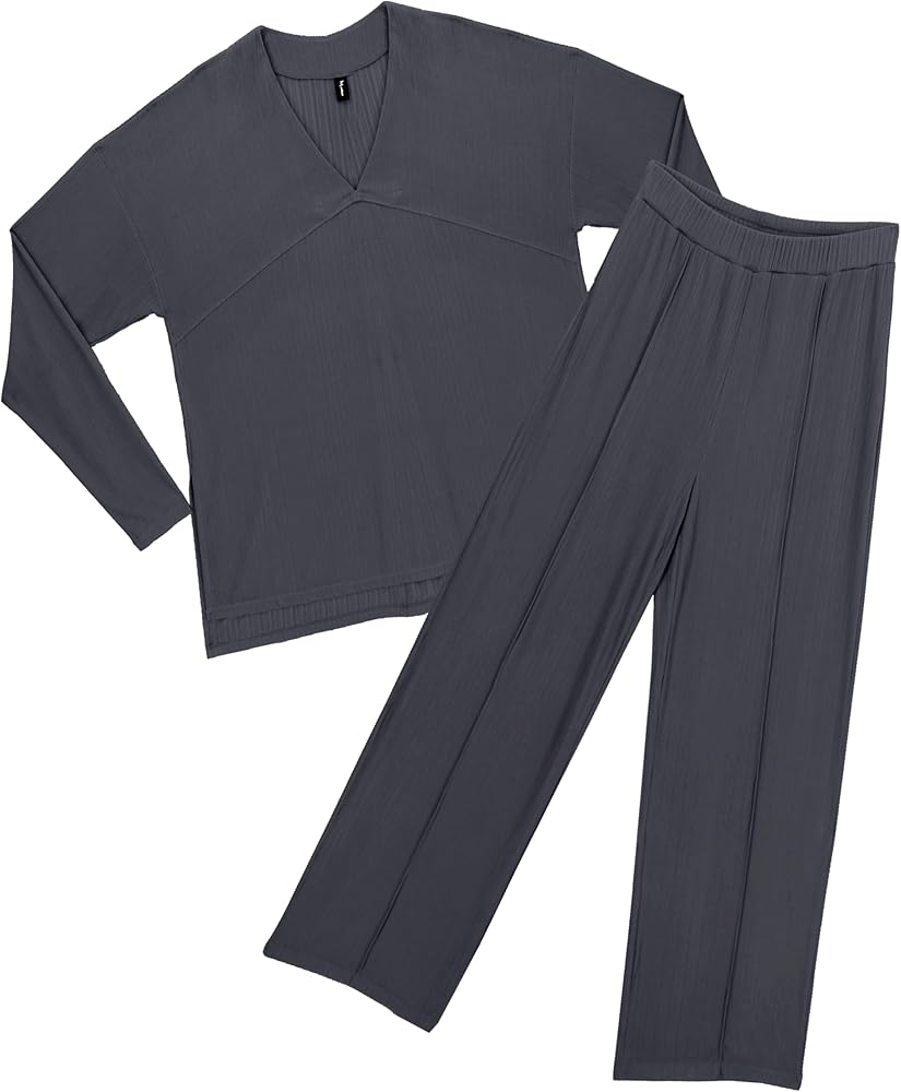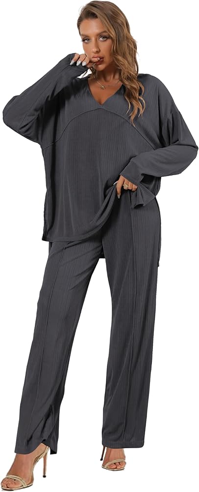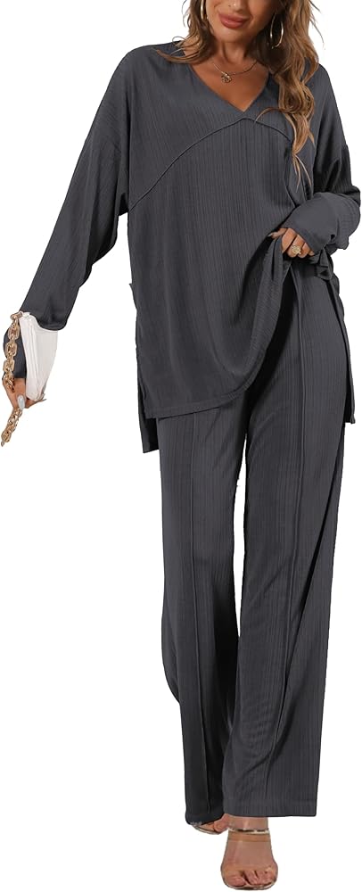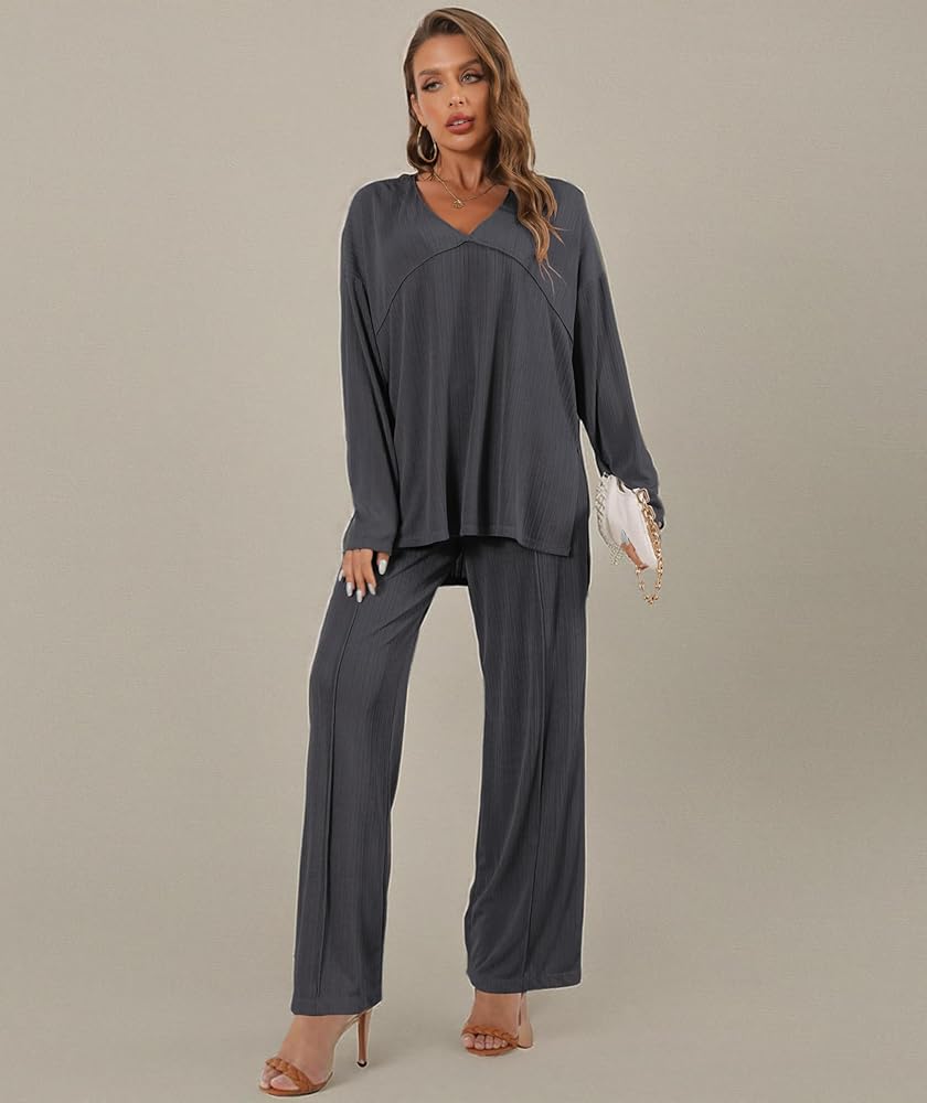Details: Women's ribbed knitted set is paired with an elegant V-neck top, making women's casual tops more refined and highlighting the neckline. Women's elastic waist trousers, wide-leg trousers with a drawstring design at the waist, giving the visual effect of elongating the body.