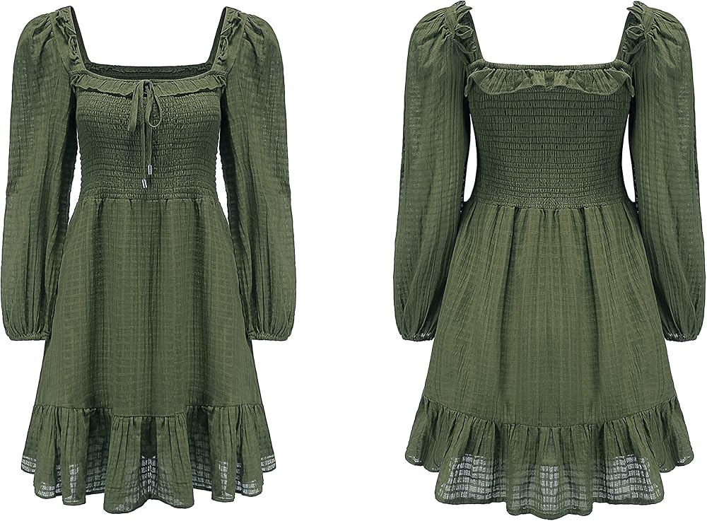 Square Neckline, Puff Long Sleeves, Frilled Shoulder Width Design, Ruffled Flowy Swing Skirt, Mini Length Dress.