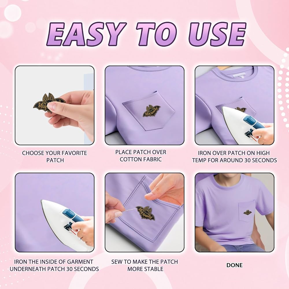 [iron on patch or sew] These patches for backpacks are with hot melt adhesive on the back, which can easily iron on or sew on, and fit firmly on without come off. The patches for clothes are very easy to apply. You can place the heated iron on the patches and DIY your style with 100-150 degrees in less than a minute. Put a thin towel to prevent burning and remove the iron and allow the patches to cool.