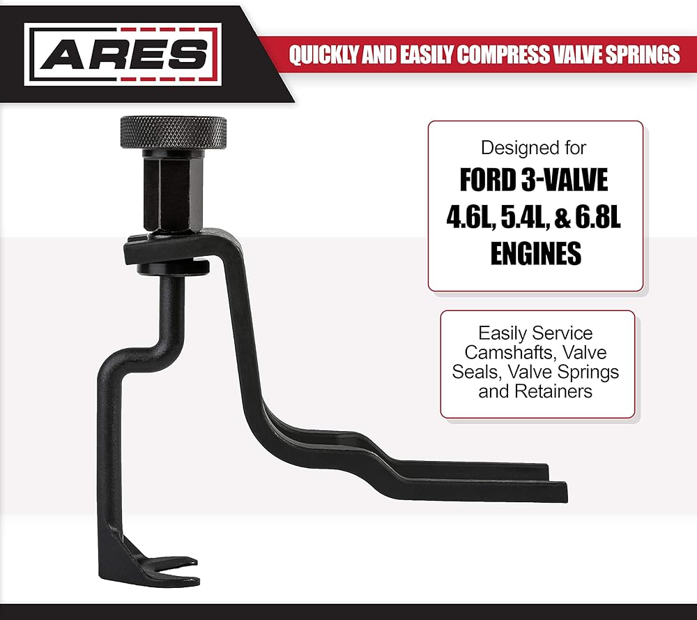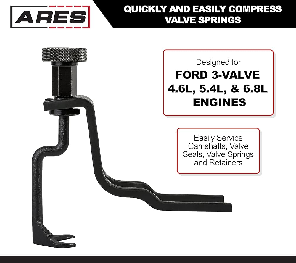 Easily Compress Valve Springs on Ford 3-Valve EnginesThe ARES Valve Spring Compressor for lets you quickly and easily compress valve springs on Ford 3-valve 4.6L, 5.4L, and 6.8L engines. Made of heavy duty Chrome Molybdenum steel with a rust- and corrosion-resistant Manganese Phosphate coating, this durable tool's precision machined components mean an exact fit every time. Whether you need to replace rocker arms, roller followers, lash adjusters, or other valve components, this tool lets you get the job done without removing the camshaft, so you can get things running smoothly again in no time. Features: Includes: 1 pc. Valve spring compressor Compatible with Ford 3-valve 4.6L, 5.4L, and 6.8L enginesDesigned to compress valve springs and assist in rocker arm, roller follower, and lash adjuster replacement without removing camshaft Made of Chrome Molybdenum Steel Manganese Phosphate coating resists rust and corrosionNote: Make sure the arm that pushes on the spring retainer has a clear path downward during use