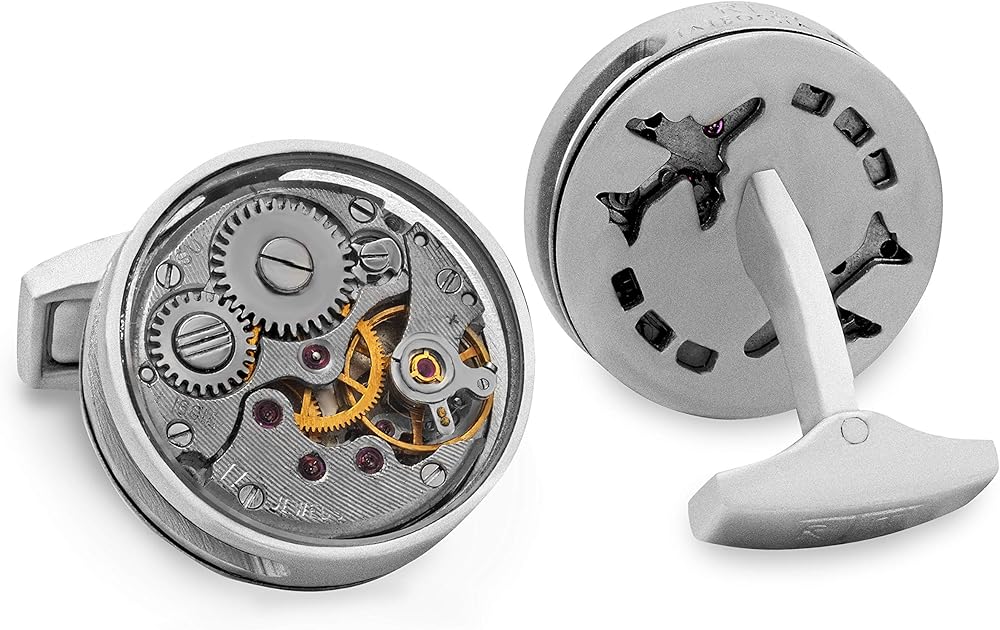The backside of the cufflink case has an airplane icon cut out, exposing the back of the skeleton movement and the top of the cufflink holds an expertly cut piece of glass covering the movement.