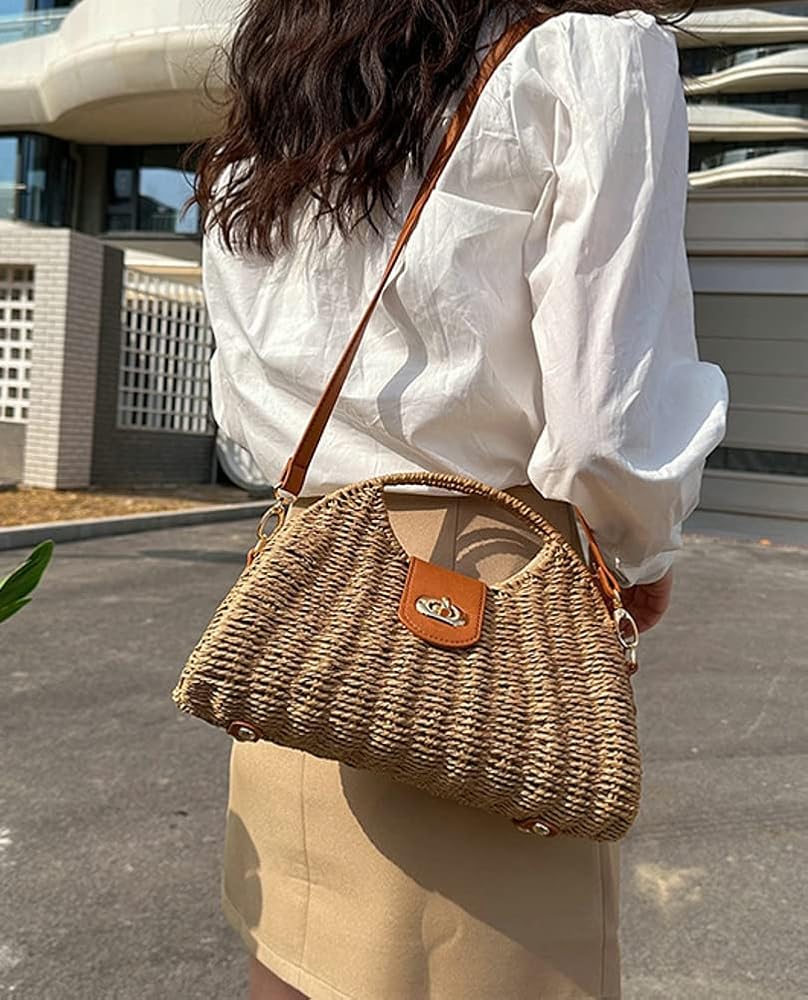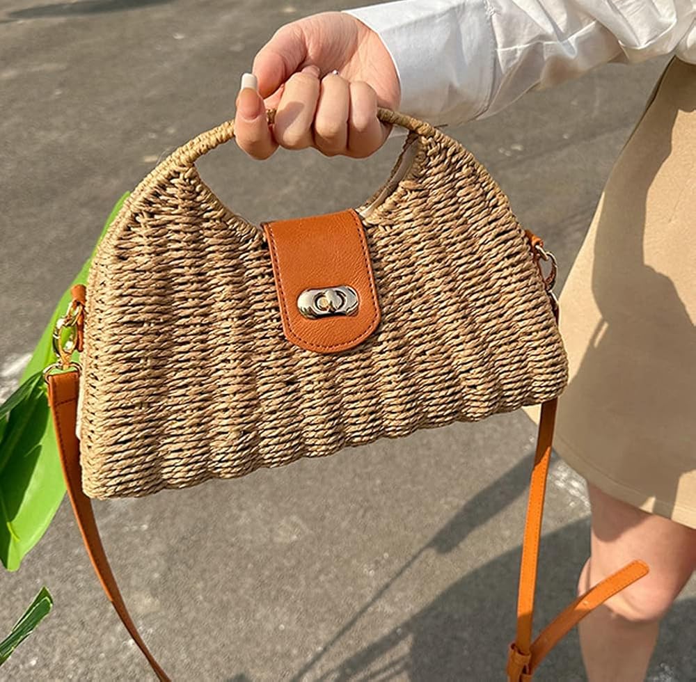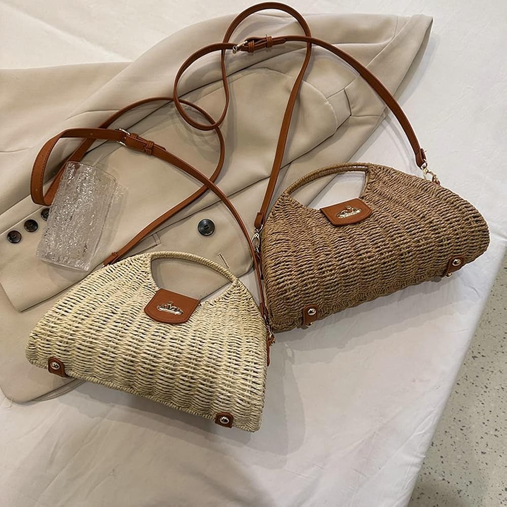 【Product Features】The Cross-body Bag for women take quality straw, natural and soft. Reinforced weaving method to strengthen all the connection, cotton polyester lining, top twist lock closure easy to open and close, removable shoulder strap, the combination of faux leather and straw gives the bag a chic style.