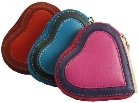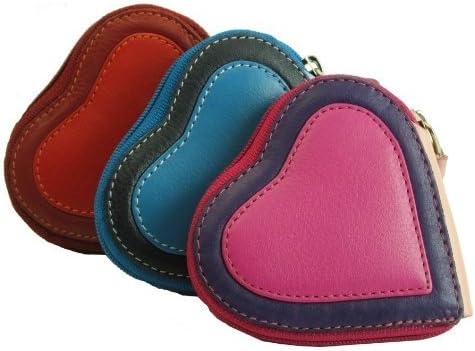 A Heart Shaped Multi-Colored Leather Coin Purse. Colors: Berry, Red and Plum Multi ;Dimensions: 3.54" x 3.15". Secure Zippered closure on top. Can be used for jewelry, keys, change etc. Contrast and double stitching