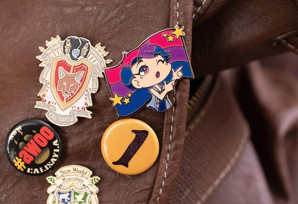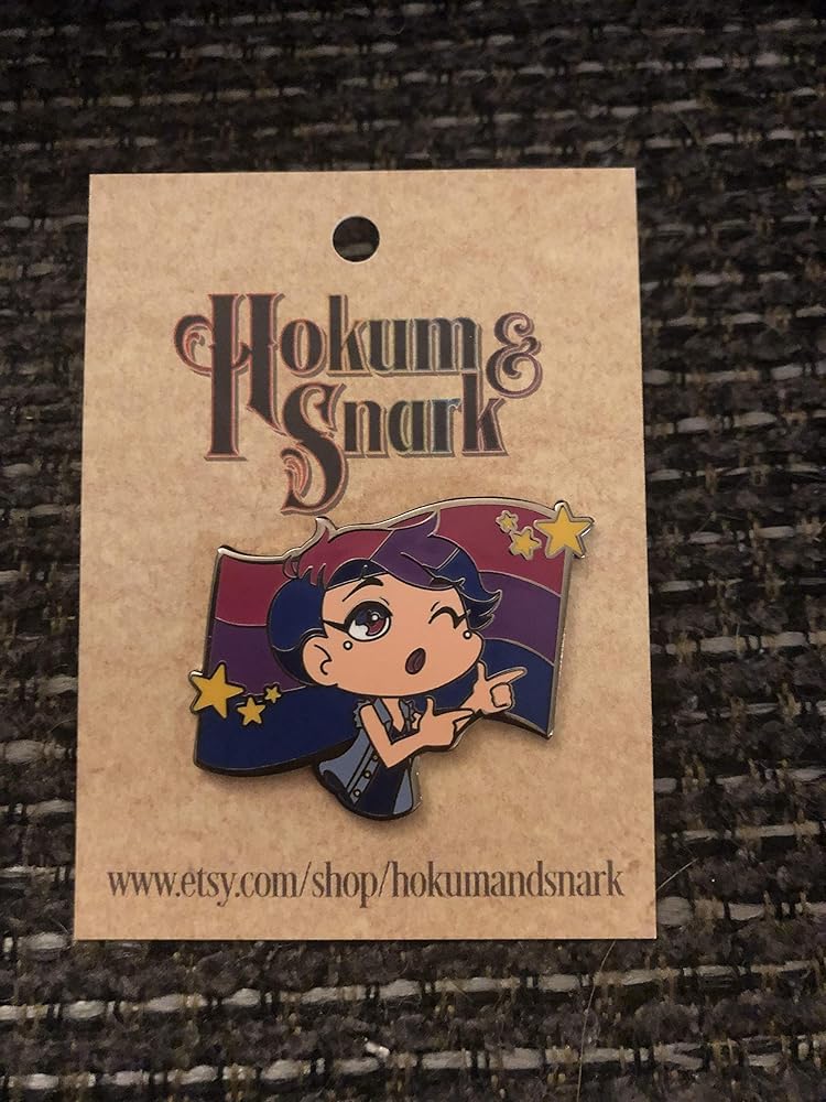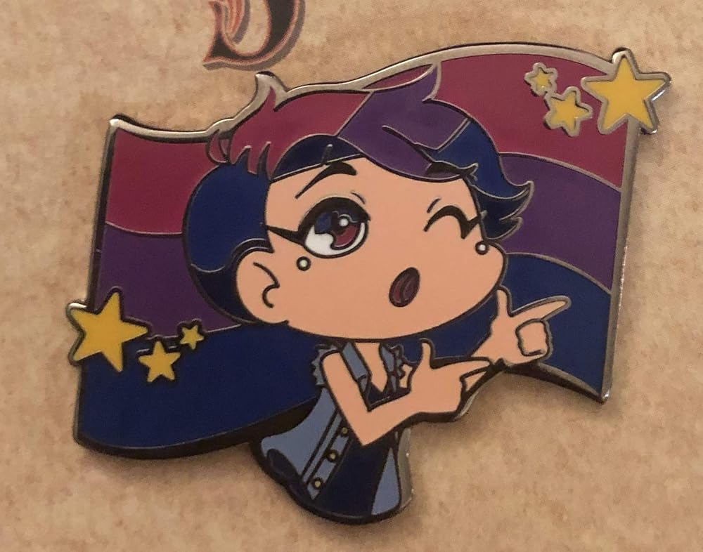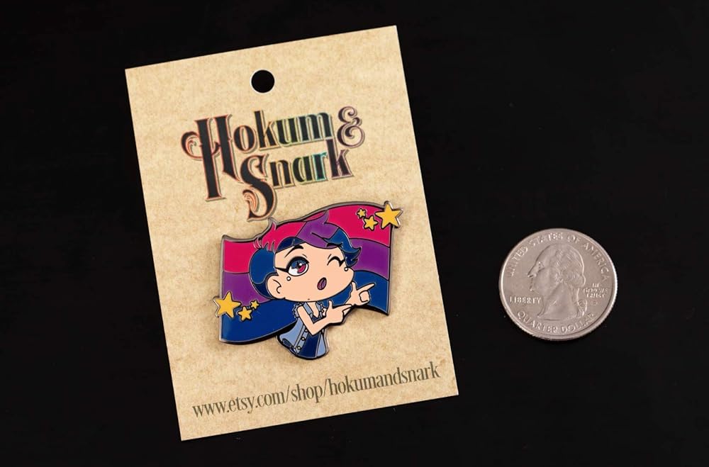 Anytime you don't know what to do with your hands BANG BANG WINK! Size: 1.25"/31.75 mm tall Thickness: 1.6mm Fill: soft enamel Finishing: black metal + front-side polished Colors: purple, pink, blue Attachment: 8mm single post + rubber clutch Each pin depicts a non-binary bisexual flexing their finger guns in front of the bi pride flag