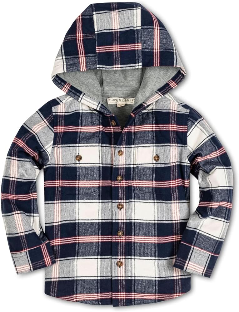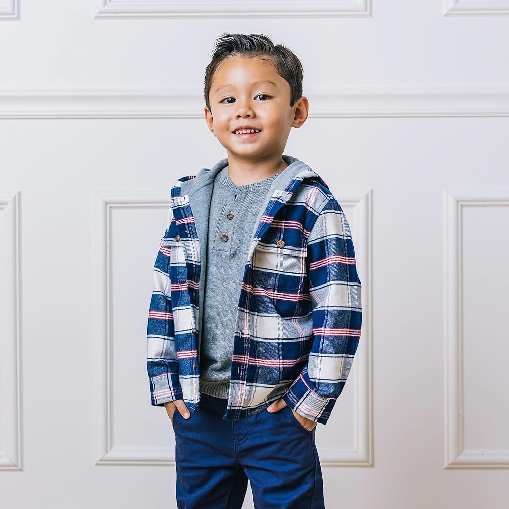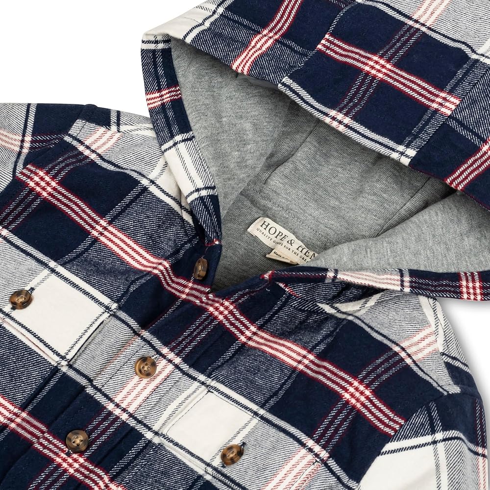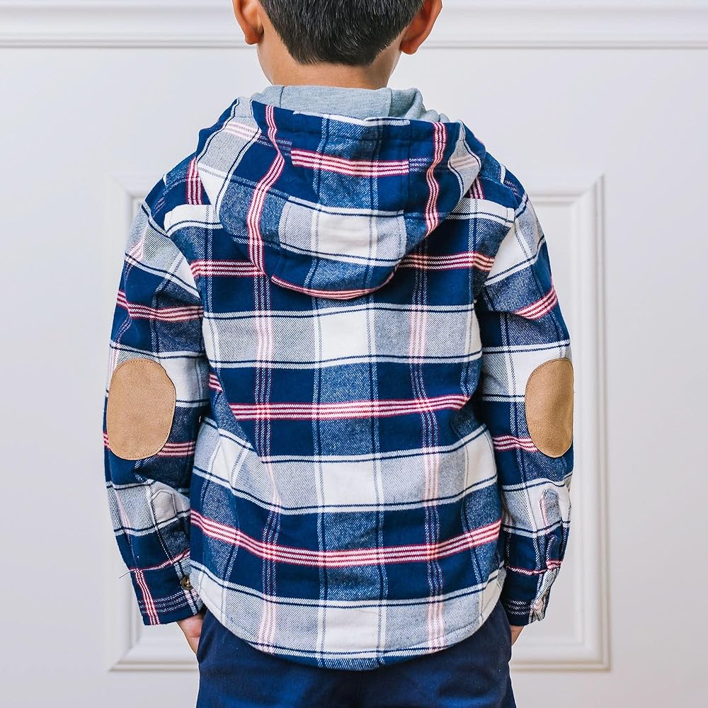 Our hooded button down shirt jacket combines the best of both worlds: soft, brushed flannel and tailored button down details. Features dapper styling such as two front flap packets, a button front closure, and faux suede elbow patches. A jersey lined body and hood keep your guy cozy and warm. He'll be throwing this on for every fall outing!