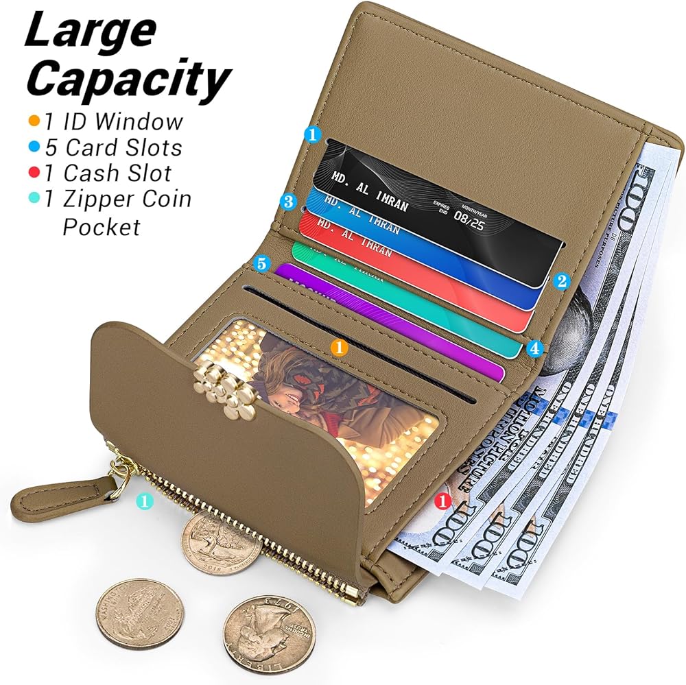 🌼Compact Yet Spacious: This wallet may be small, but it offers plenty of room for your essentials. With five ID slots and one ID window slot, you can conveniently store your driver's license, photo, and credit cards. The multiple card slots provide ample space to organize all your cards, while the cash slot securely holds your bills in place.