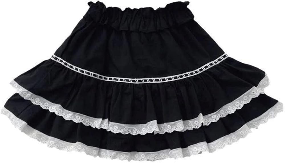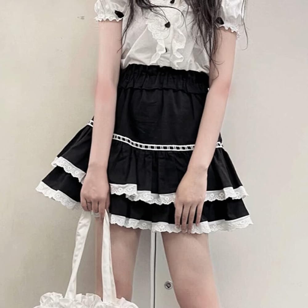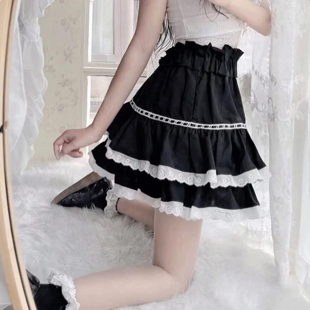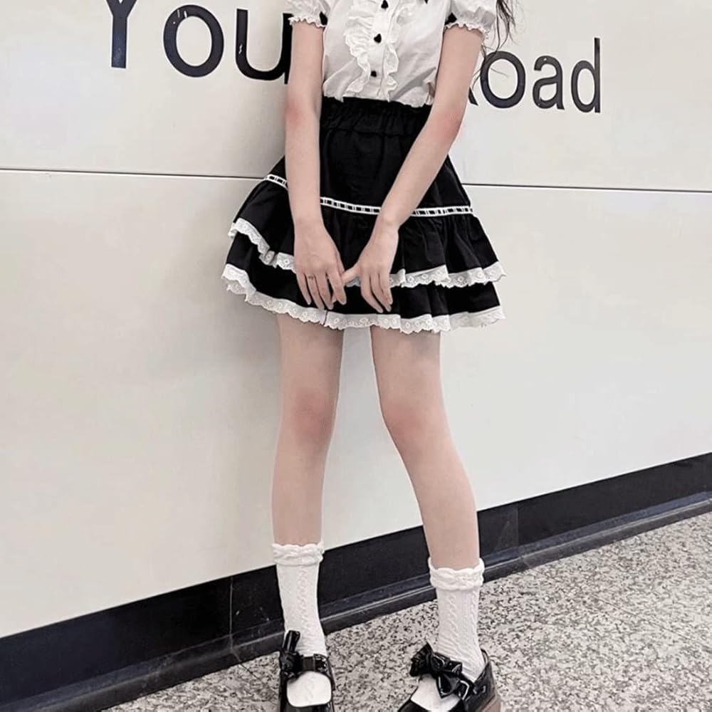 Design: Harajuku kawaii fashion high elastic waist layered skirt with shorts inside, double layered lace hem trim, above knee length, cute tiered plaid short skirt for women, girls and teens.