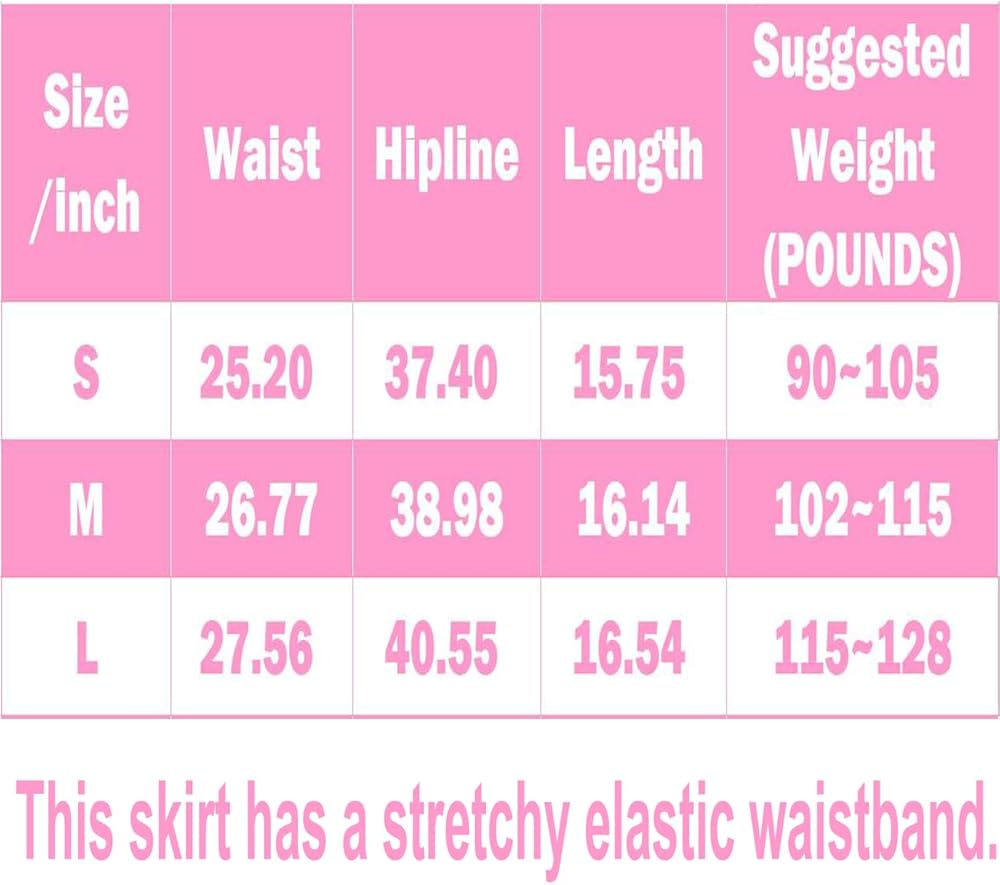 Size Details: S: Waist 25.20", Hipline 37.40", Skirt Length 15.75"; M: Waist 26.77", Hipline 38.98", Skirt Length 16.14"; L: Waist 27.56", Hipline 40.55", Skirt Length 16.54". The error in measurement is about 1 inch. Please note that this skirt has a stretchy elastic waistband.
