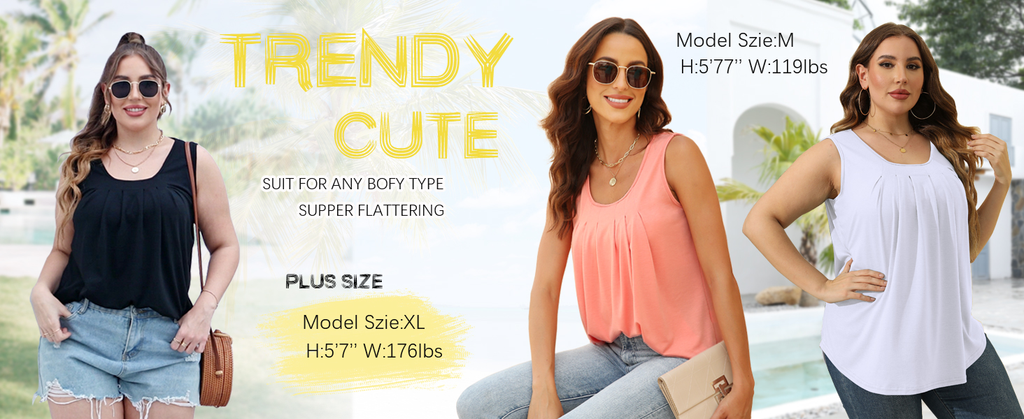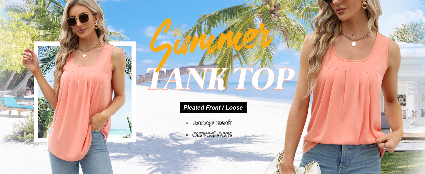 Design: Scoop Neck Tank Tops with Pleat Front/Flowy Tank Tops that Hide Belly Fat/Loose fit style Flattering any body shape