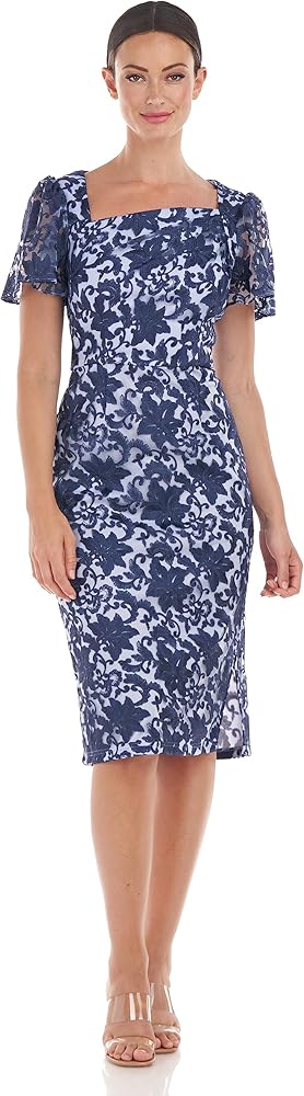This stunning Ellie Flutter Cocktail Dress is cut from daffodil embroidered mesh and features an asymmetric neckline for an ultra-feminine look. The flutter sleeve and sheath silhouette enhance the style while the below the knee length offers maximum comfort. Feel confident and beautiful wearing this classic and timeless design.