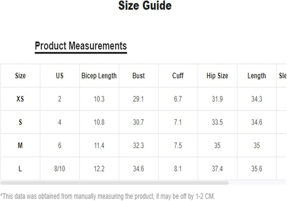 X-Small: Bicep Length: 10.3", Bust: 29.1", Cuff: 6.7", Hip Size: 31.9", Length: 34.3", Sleeve Length: 23.9", Waist Size: 23.6"
