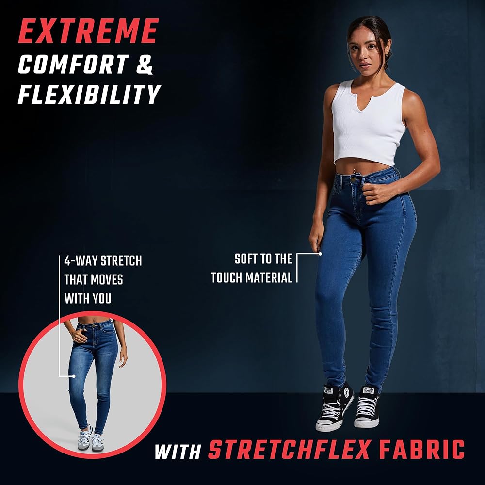 STRETCH FLEX MATERIAL - Our women's jeans are made of 66% cotton, 32% polyester, and 2% spandex. This combination of materials provides a durable yet comfy feel, with a 4-way stretch that is perfect for any activity.