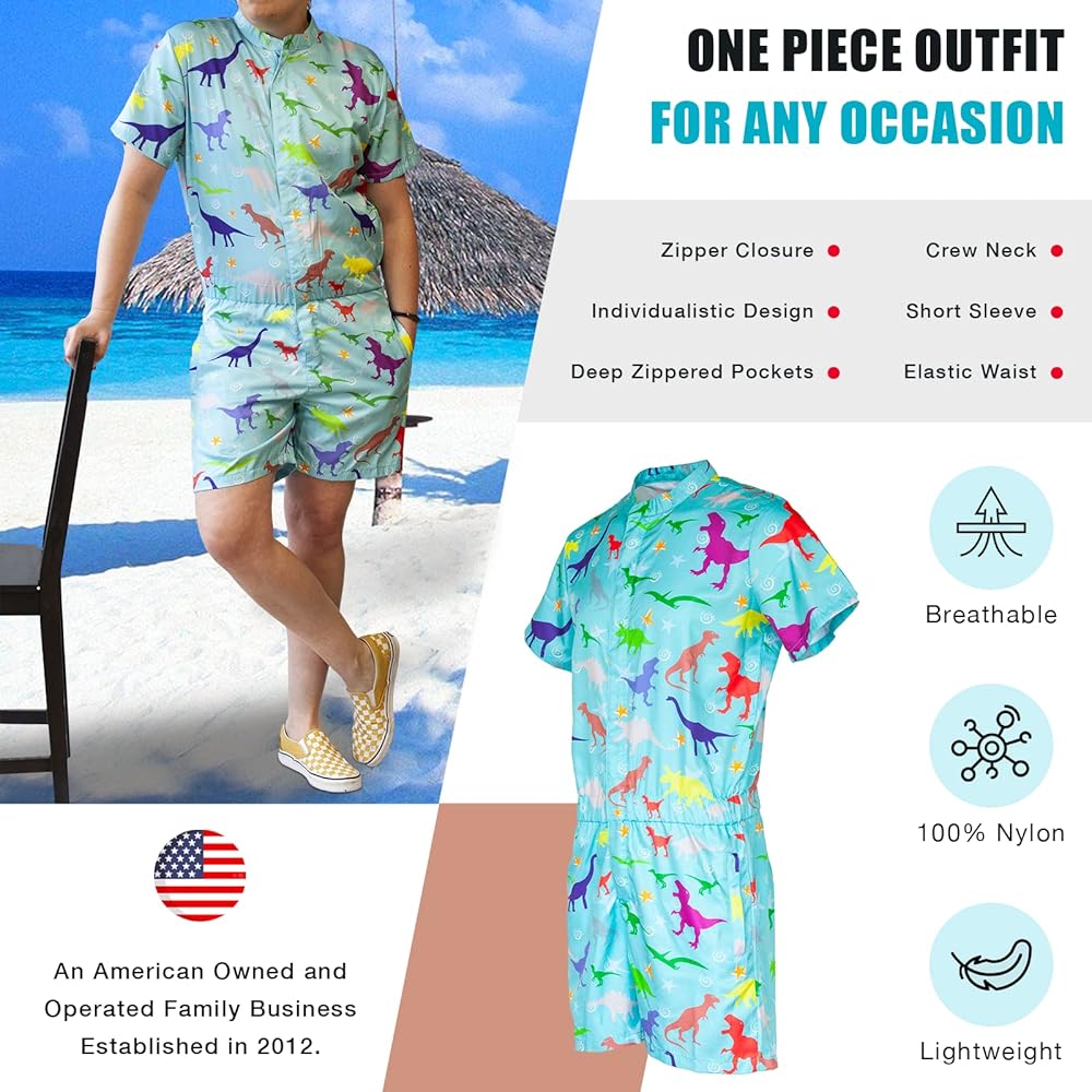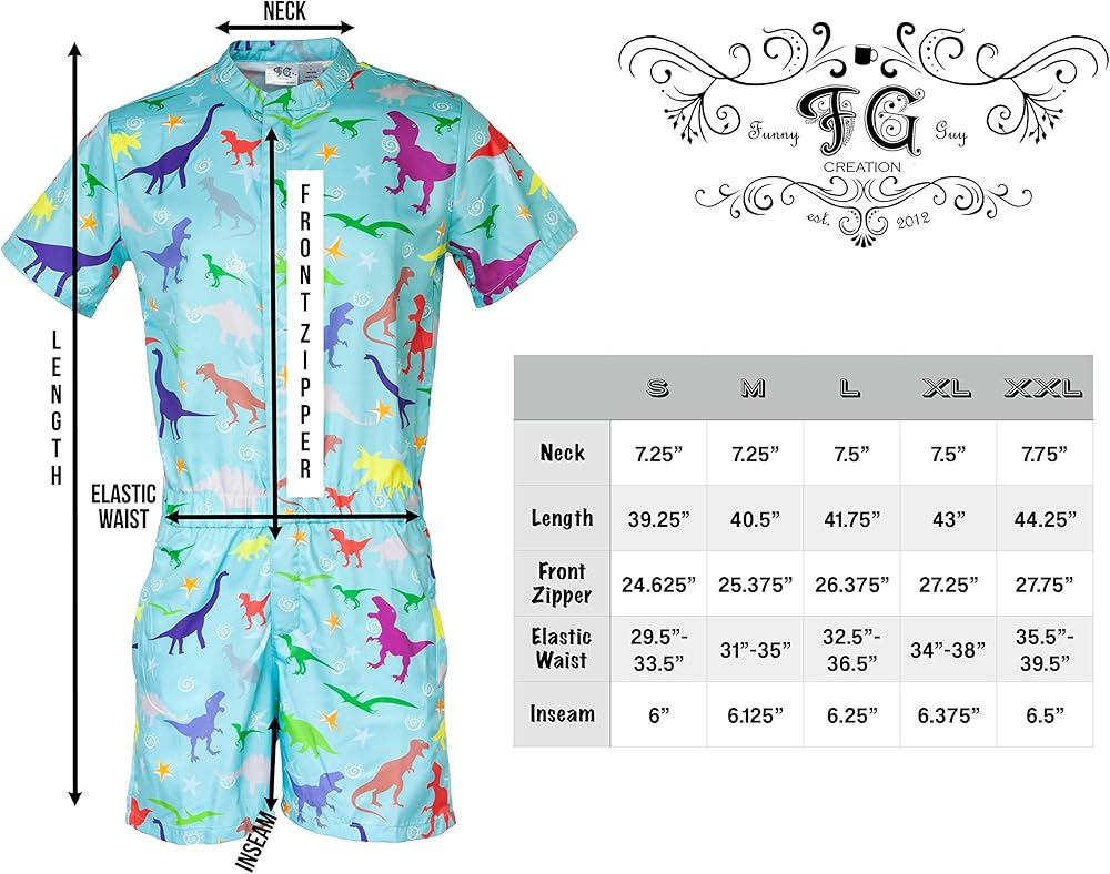CONTENTS INCLUDE: 1 Adult Romper; Contents Come New In A Sealed Bag. MATERIAL: 100% Nylon 13.05oz (370g). FEATURES: Full Print Original Artwork; 2 Zippered Side Pockets; Full Front Zipper Closure; Elastic Waistband; Machine Or Hand Wash - No Special Care Needed. SIZING: SIZING: SMALL: 29.5"-33.5" Waist, 6" Inseam, 7.25" Neck, 39.25" Length, 24.625" Front Zipper; MEDIUM: 31"-35" Waist, 6.125" Inseam, 7.25" Neck, 40.5" Length, 25.375" Front Zipper; LARGE: 32.5"-36.5" Waist, 6.25" Inseam, 7.5" Neck, 41.75" Length, 26.375" Front Zipper; X-LARGE: 34"-38" Waist, 6.375" Inseam, 7.5" Neck , 43" Length, 27.25" Front Zipper; 2X-LARGE: 35.5"-39.5" Waist, 6.5" Inseam, 7.75" Neck, 44.25" Length, 27.75" Front Zipper; Please See Sizing Image For More Details. ABOUT FUNNY GUY MUGS: These Rompers/Jumpsuits Were Created Exclusively By Funny Guy Mugs. Funny Guy Mugs Is A Trusted Company Founded By Brothers Whose Mission Is To Create High Quality Products That Put A Smile On Your Face!