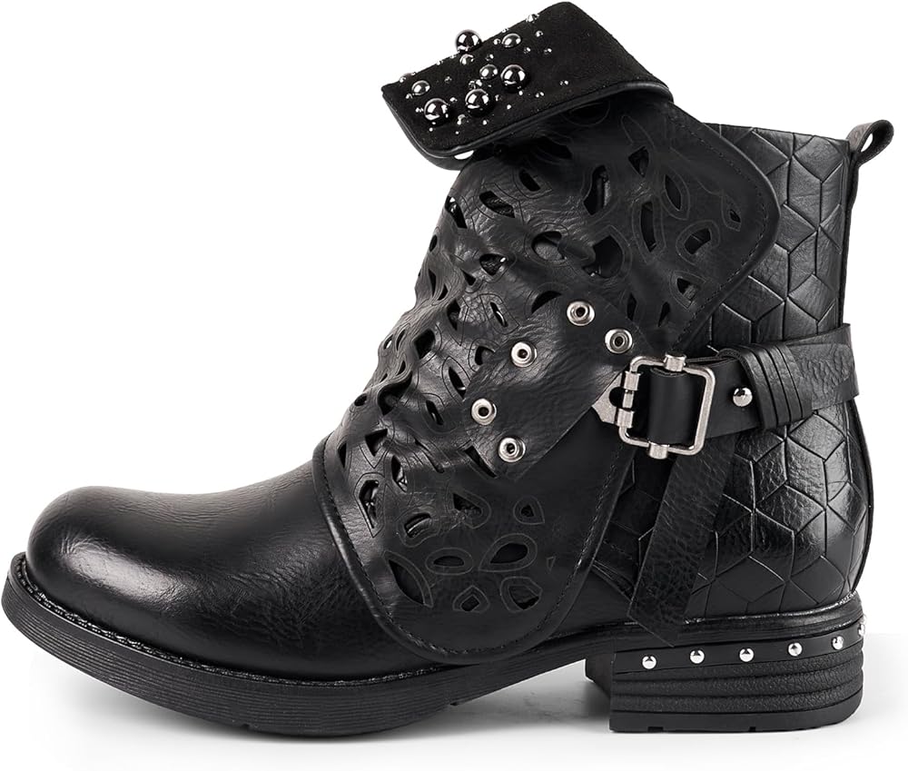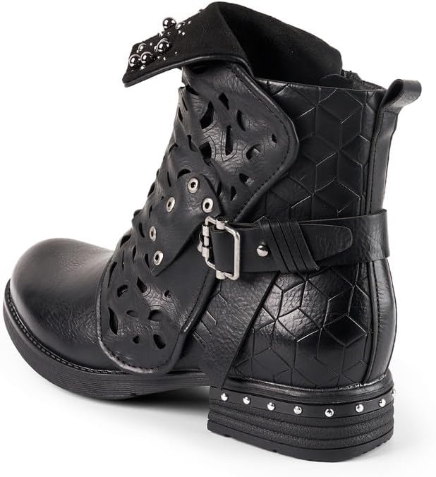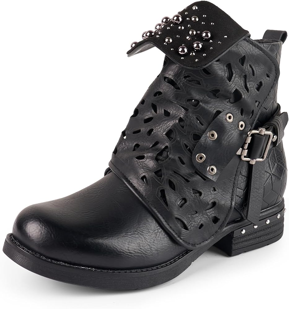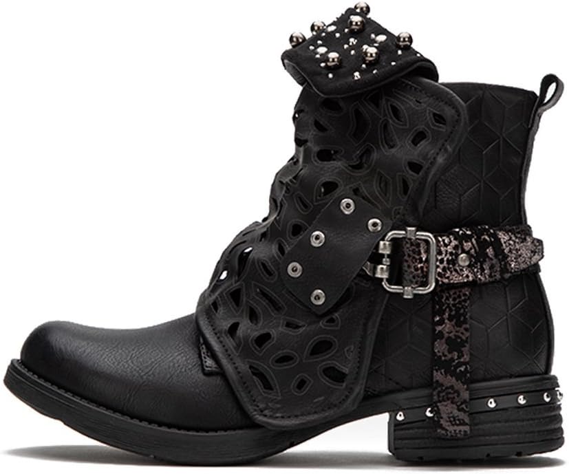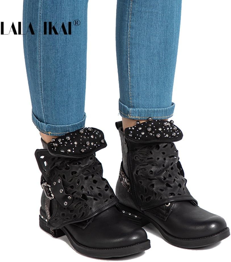 LALA IKAI Women Motorcycle Boots Combat Ankle Combat Boots with Studded Low Block Heels Biker Shoes Black/Gray/Brown
