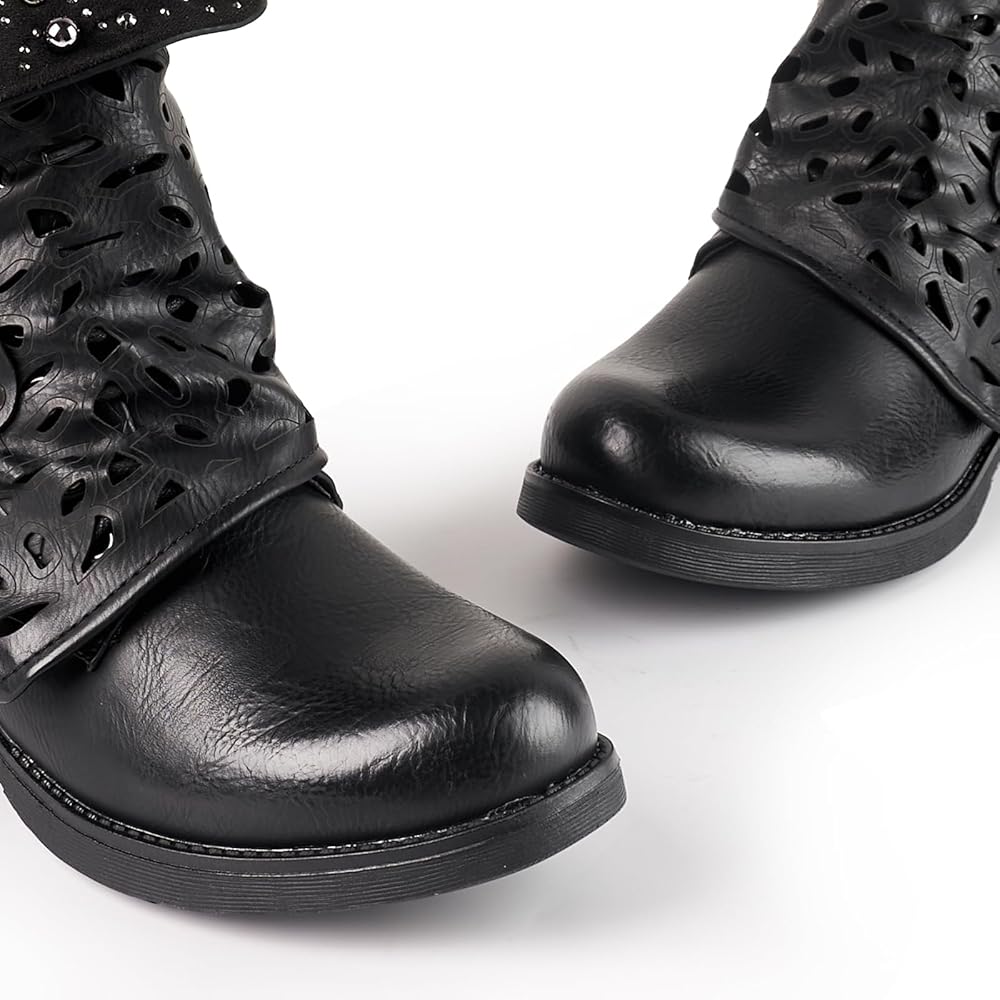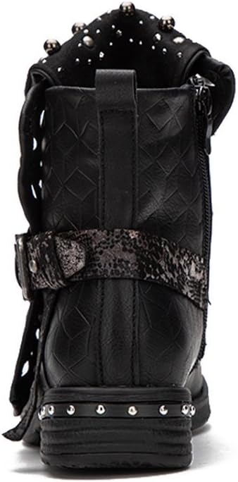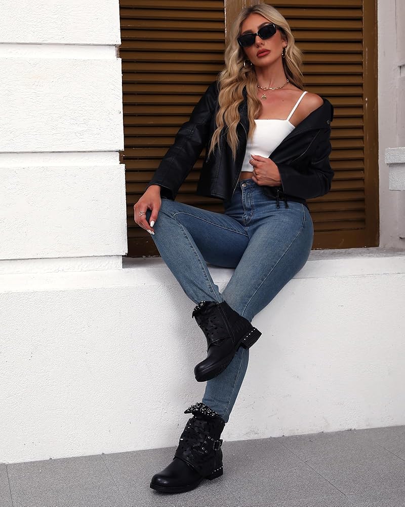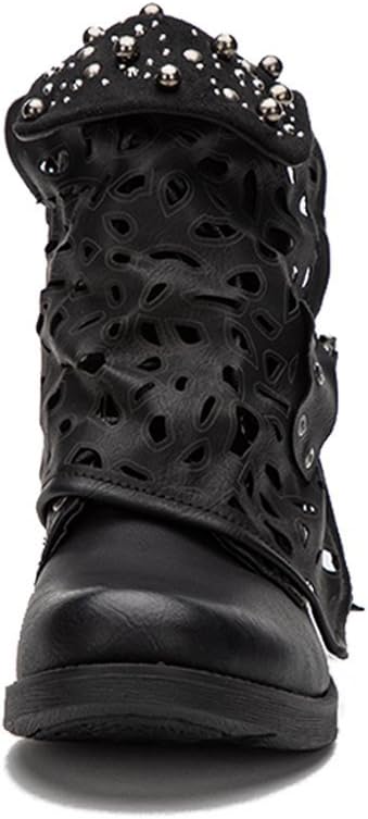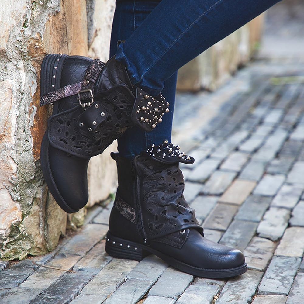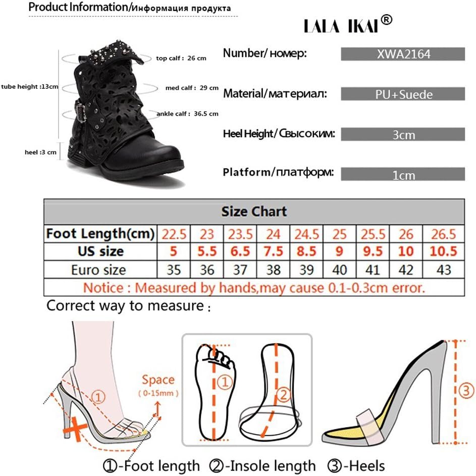 LALA IKAI Women Motorcycle Boots Combat Ankle Combat Boots with Studded Low Block Heels Biker Shoes Black/Gray/Brown