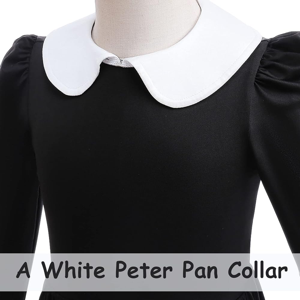 Girls Halloween Costume Design:The girls black wednesday halloween costumes dress has a Peter Pan Collar,and back design with hook and loop,easy put on and take off. Long sleeve, high waist, above knee length, solid black and slim fit flare dress features white collar.