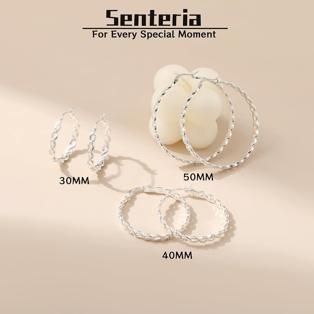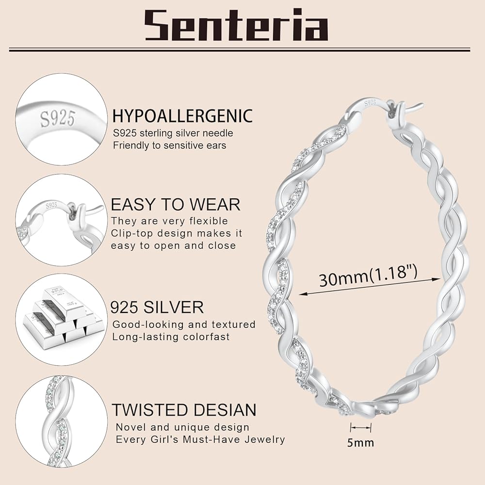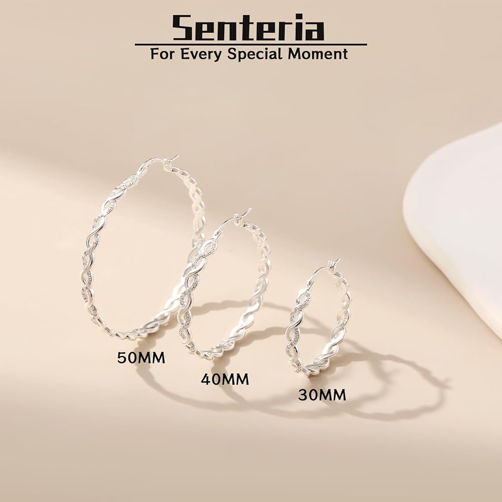 Senteria S925 Sterling Silver Hoop Earrings for Women Hypoallergenic Twisted Hoop Earrings with AAA+ Cubic Zirconia Lightweight Large Silver Hoops Earrings for Women (30/40/50MM)