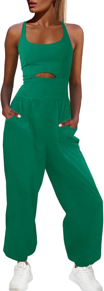 Panadila Womens Workout Onesie Athletic Romper One Piece Jumpsuits Backless Tops Hiking Pants with Pockets (Green,M)