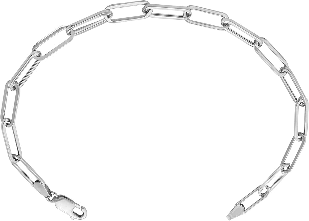 This stylish "Paper Clip" bracelet is comprised of interconnected, rounded rectangular links in 14k White Gold. This unique bracelet is available in lengths 7 to 8 inches, with half sizes in between. These bracelets are best worn when paired with the necklace variation of the Paper Clip Style.