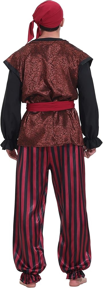 Pirate Costume Men Plus Size Includes:Totally 5 pieces set,1*Medieval black pirate shirts;1*Steampunk pirate vest jacket ;1*Renaissance pirate pants ;1*red belt ; 1*red headband.