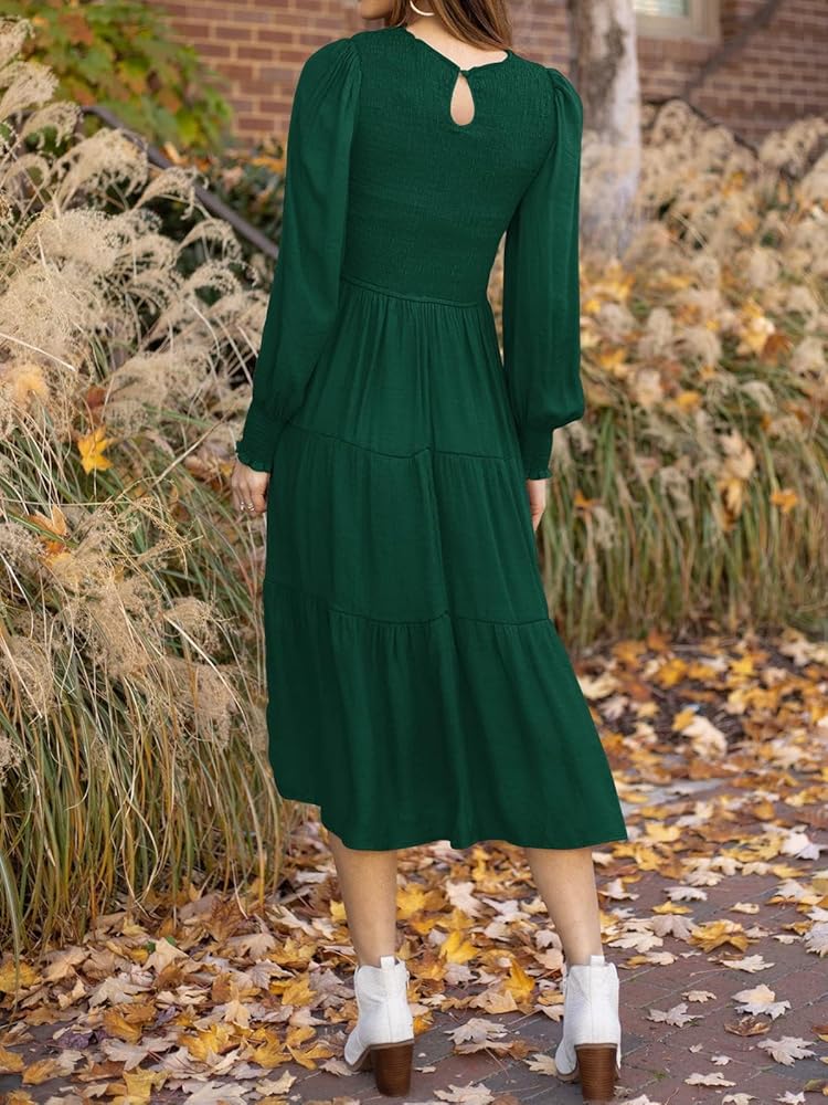 Features: round neck, long sleeves,panelled hems,solid color.The special craftsmanship of the sleeves and upper body makes the dress even more attractive.