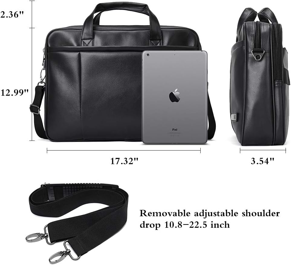 Perfect Dimensions:(L)17.32×(W)3.54×(H)13 inch. Wet weigh is 2.09lb.Top handle strap is 3.94 inch with removable long shoulder strap about 23.62-26 inch. The leather briefcase is just the right size, lightweight and can be carried in 3 ways.