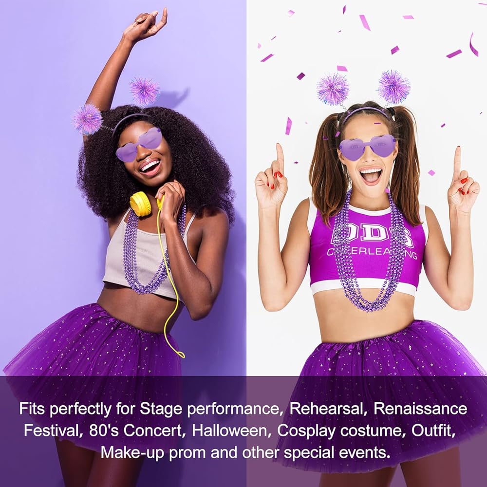 【Reliable Material】-- Pom Pom headband is made of flexible plastic and spring, safe, lightweight, sturdy and not easy to break or fade, the party sunglasses is made of plastic, bright and exquisite, the bubble skirt is made of 3 layers fabric, comfortable and soft, bead necklace is made of plastic, reliable and lightweight, you can use them for a long time. Suitable for most teenagers and adults, lightweight, comfortable and soft to wear, suitable for costumes, parties and other occasions.