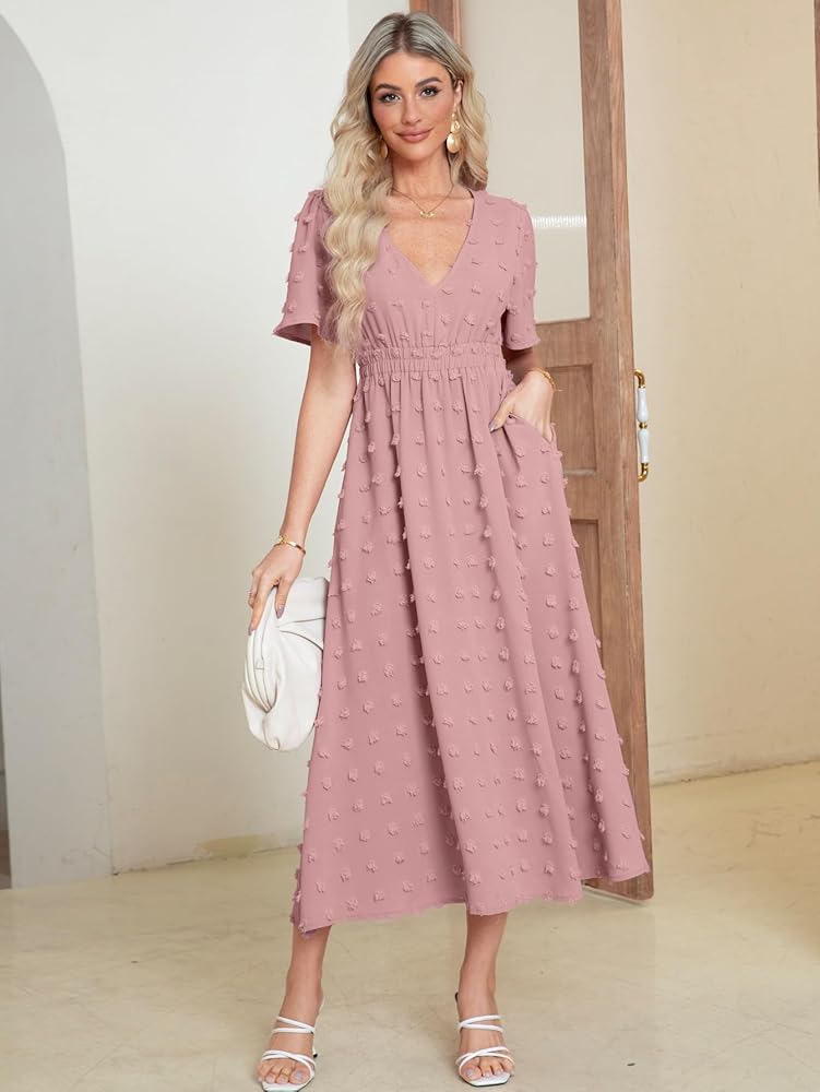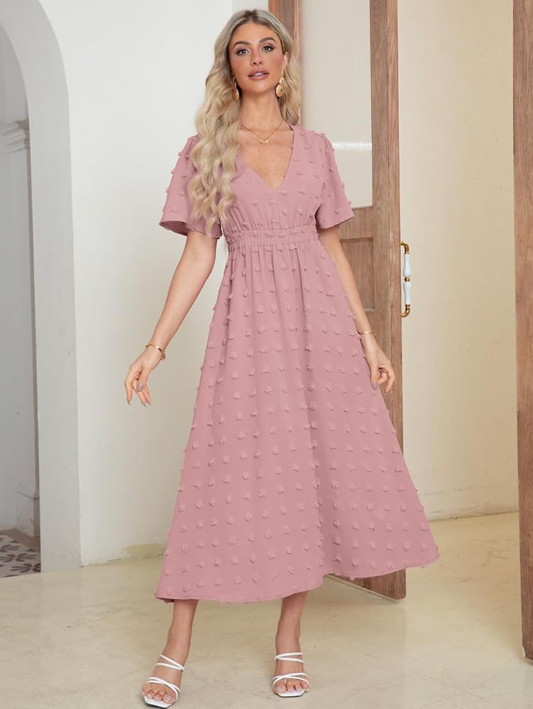 Features: flutter sleeve flowy long dresses, maxi sundress, boho maxi dress, polka dot dress, flowy dresses for women,empire elastic waist maternity dress, short sleeve baby shower dress, v-neckline and loose fit for maximum sass and sweet looks.