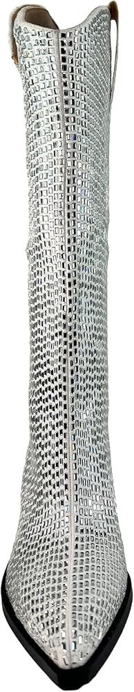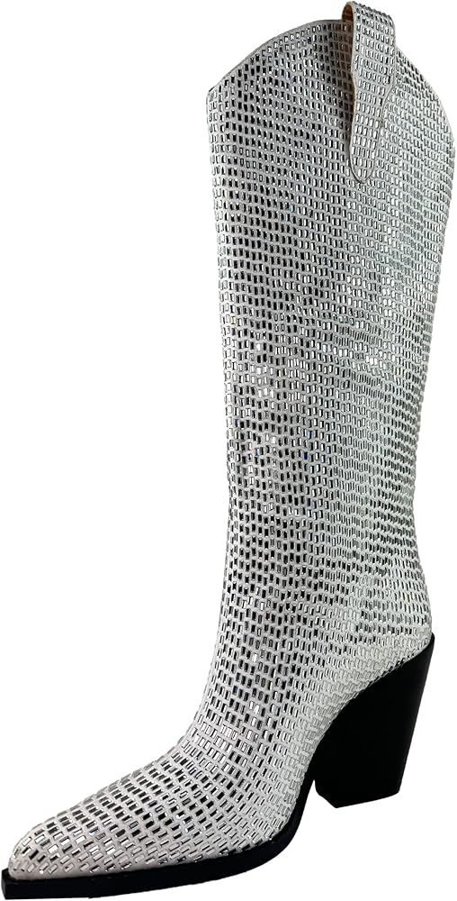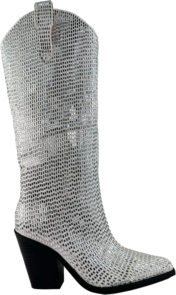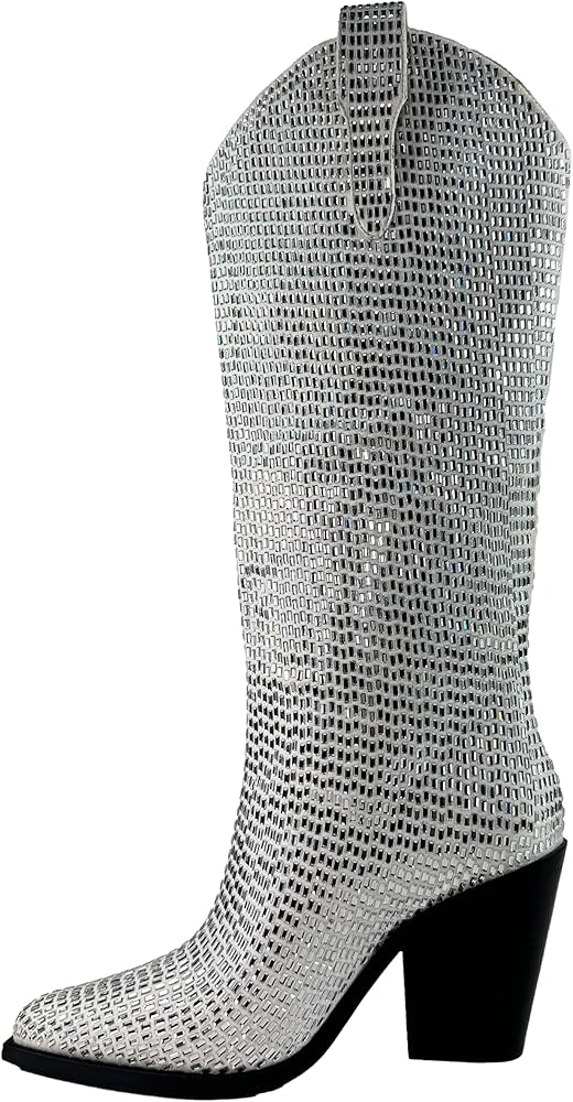 A western-inspired knee-high square rhinestone embellished fashion boots that fit every party and night out occasion.