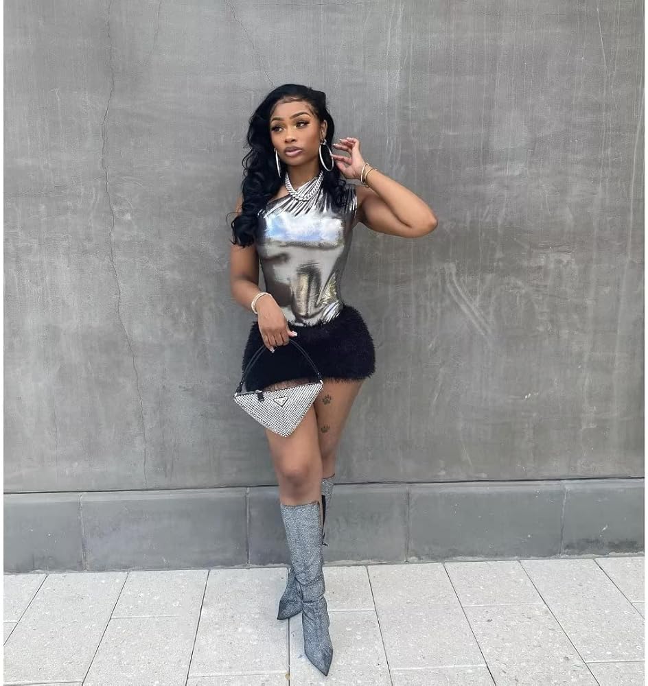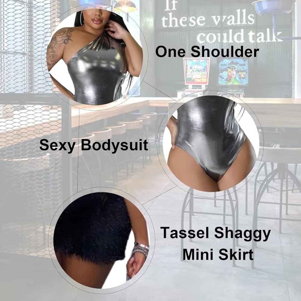 Features: Two piece sexy hot bodycon skirts for women,one shoulder off, sleeveless, shiny metallic jumpsuit, sexy hot bodysuit for women,tassel shaggy mini skirt bottom, slim fit, stretchy, bandage skirt, high elastic jumpsuit easy to put on and take off.