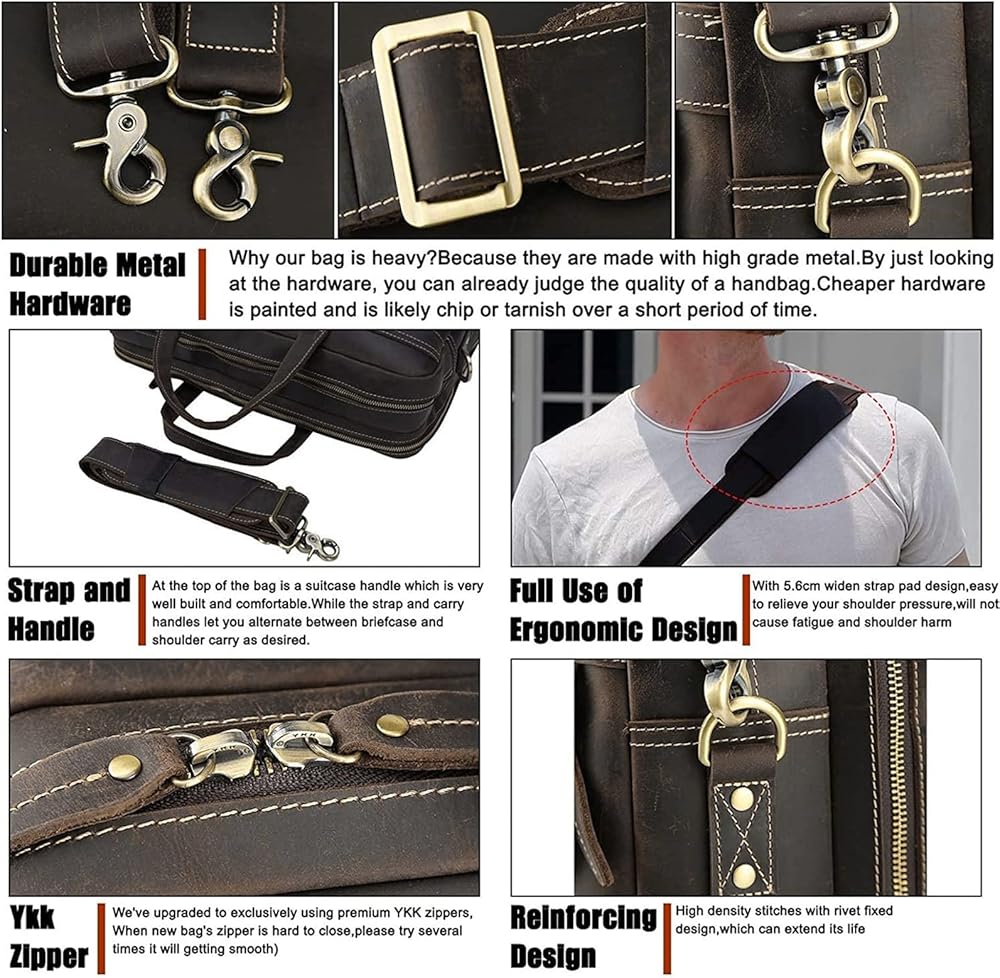 Crazy horse leather processing can mainly keep the unique natural texture of cowhide leather. The new men's leather laptop brief case has a vintage look, whose color may get different when you scratch over the surface, but you can remove the “scratches” with eraser easily. Try to enjoy the fun while drawing with your finger nails on the bag! As time goes by, the raw texture will be worn slowly and the leather of bags looks brighter and seems "newer".
