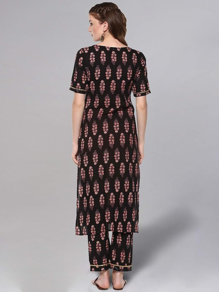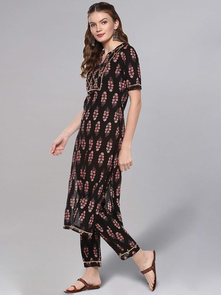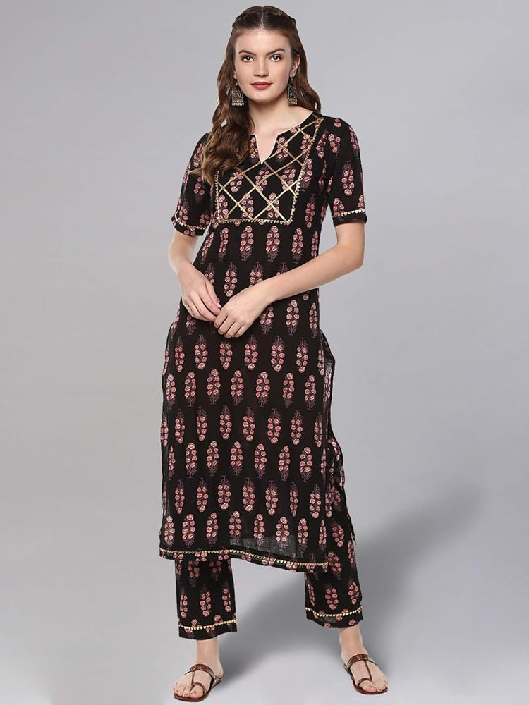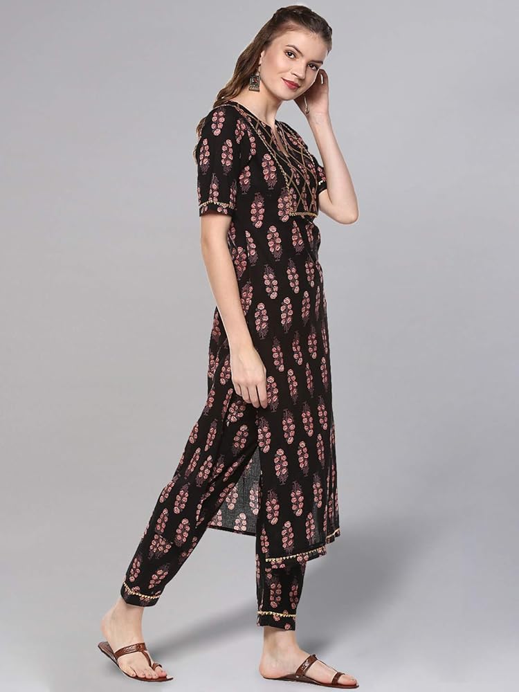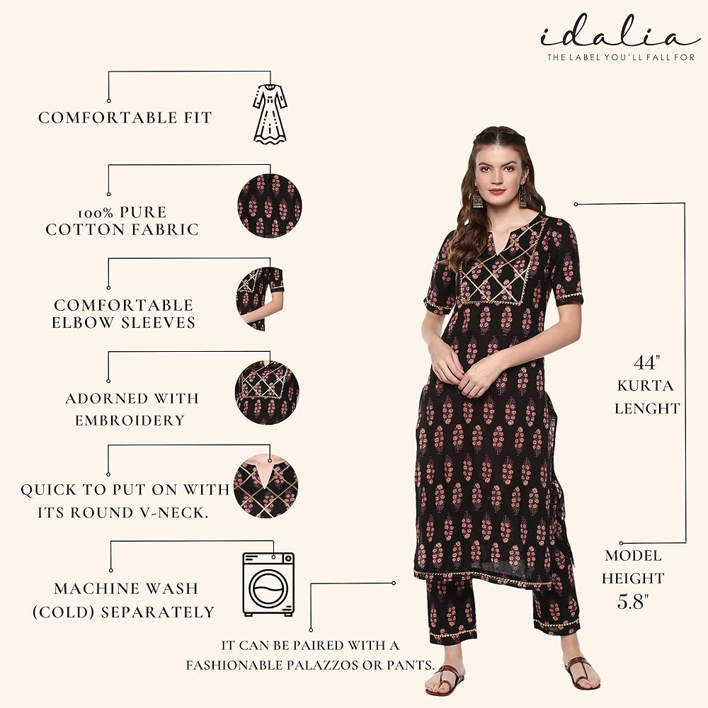 This kurta palazzo set from Idalia is a mix of smartness and grace. The lovely printed work throughout the attire is awe inspiring and comes with matching bottom. Pair it with strappy sandals to accentuate the overall appearance