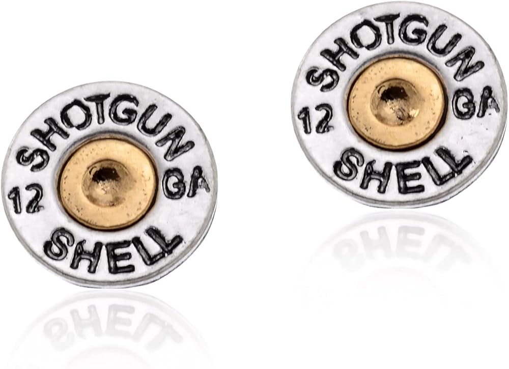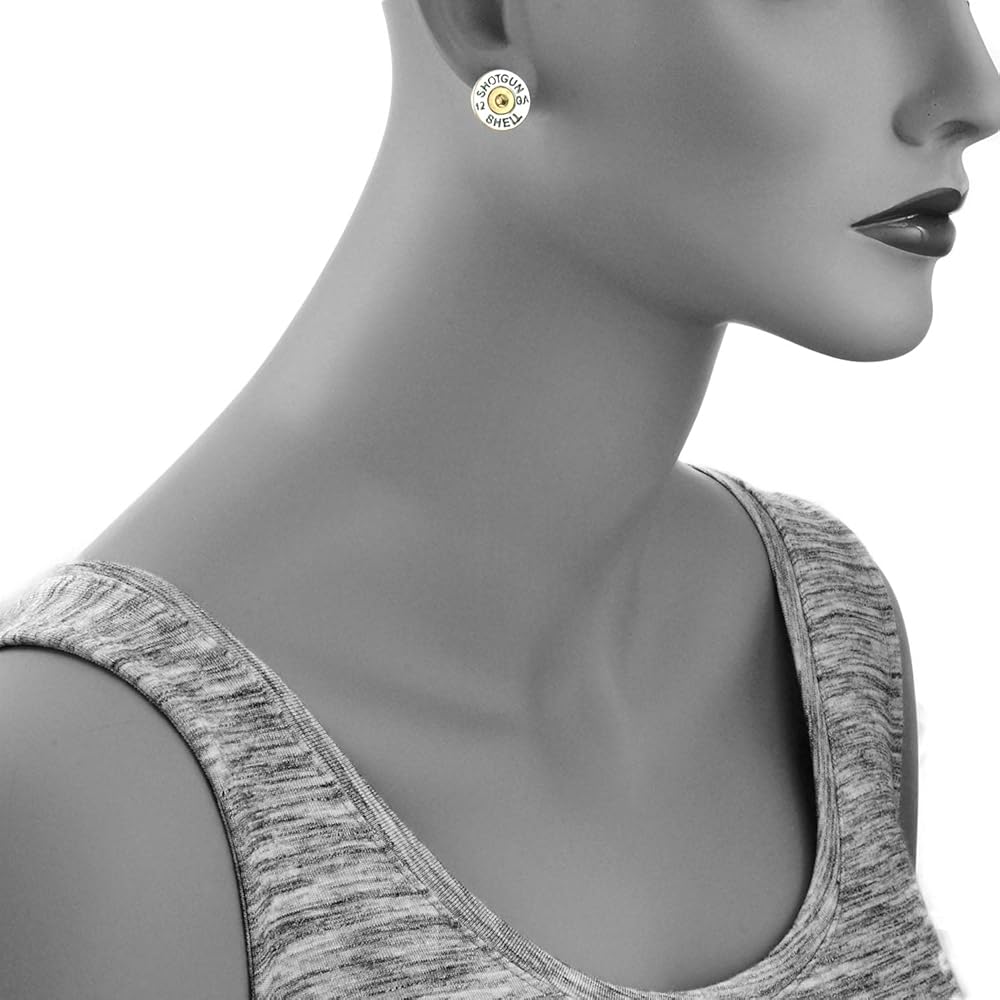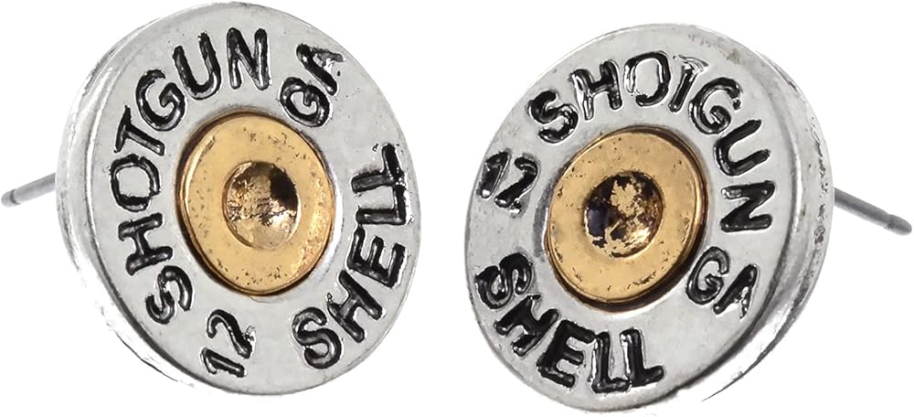 Here is a simulated pair of bullet casing post earrings with 12 GA SHOTGUN SHELL imprinted. Earrings measure 15mm in diameter on post backings. Comes in gift box.