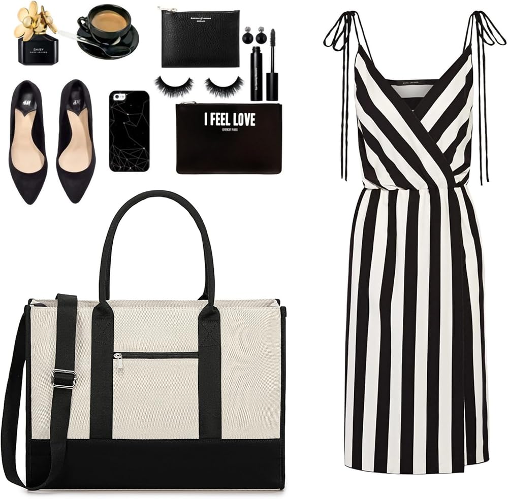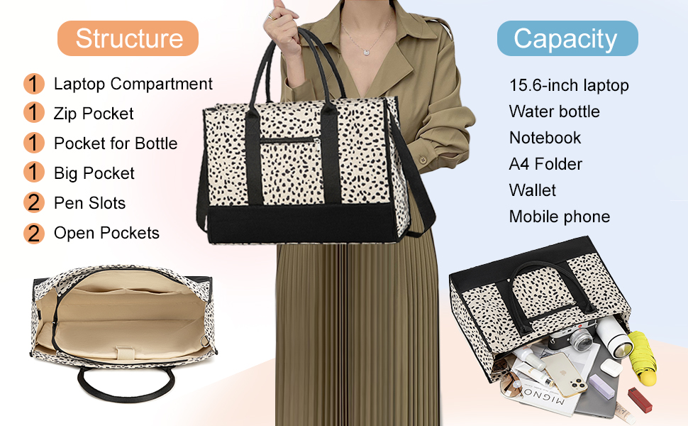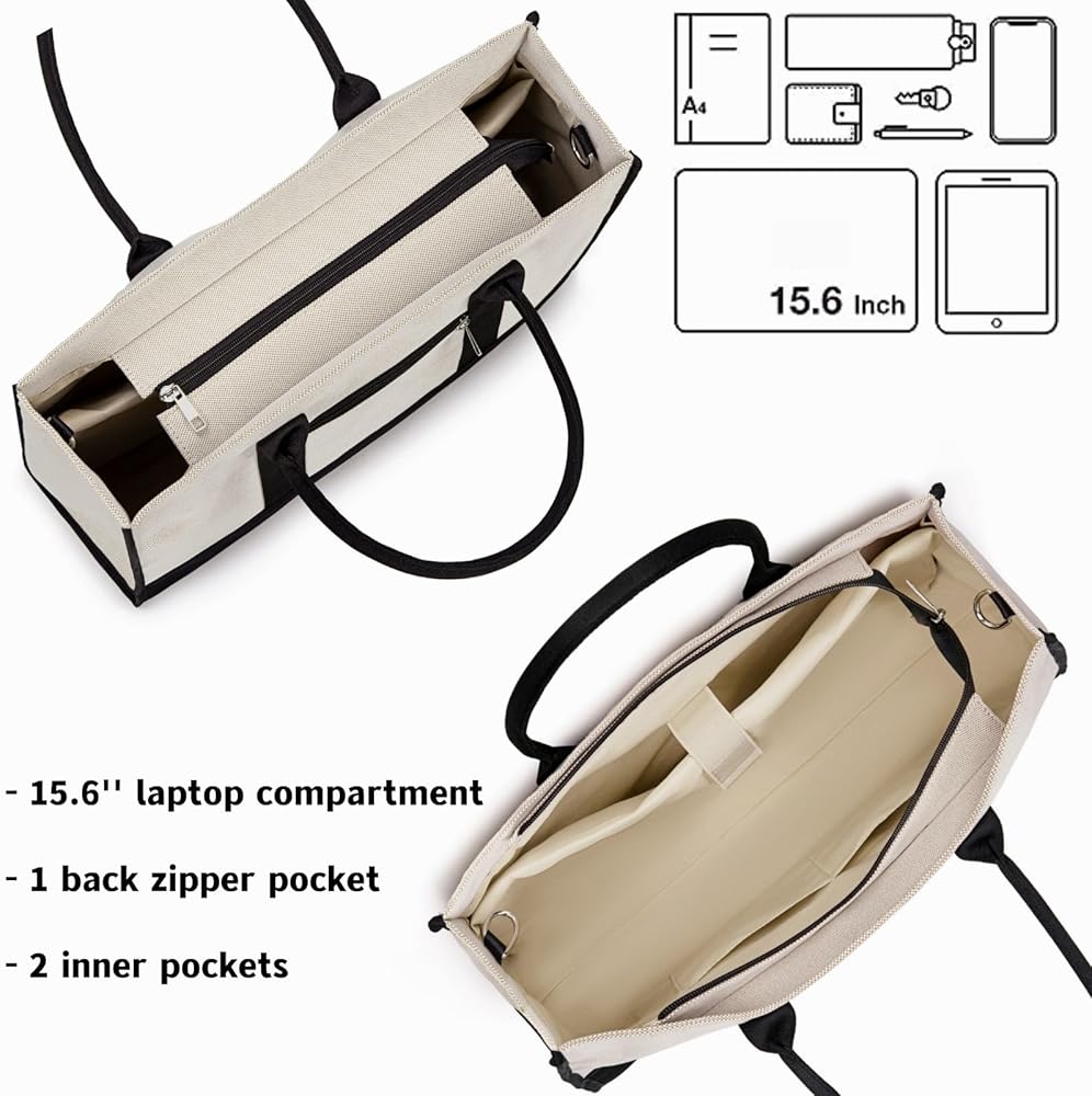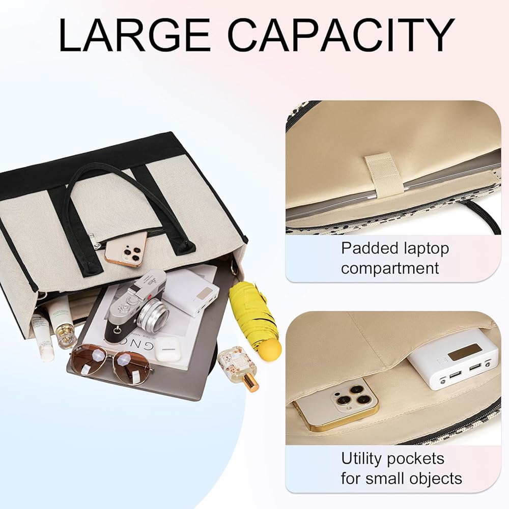 Large Capacity Laptop Bag:The dimension of the tote bag:17 x 12.5 x 5 in (L*H*W). The work tote bags for women is available for keeping all your stuff organized. It is made of premium canvas with sturdy hardware. The durability of the teacher tote bag is fantastic with a strong structure,can sit upright on its own.