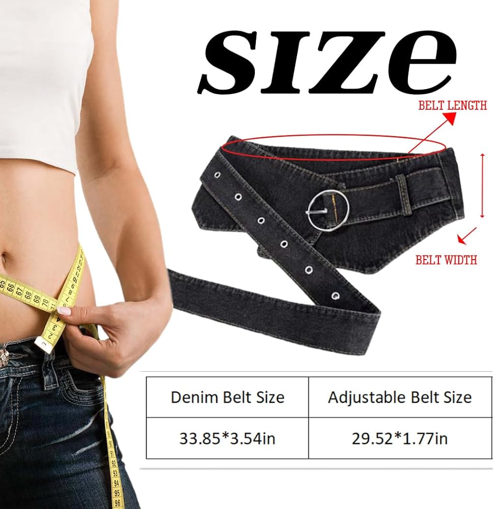 • Waist belt size:Denim belt is 33.85in circumference, and approx 3.54in width.regulating band is 29.52*1.77in.suitable for women with a waist circumference of 25.59-38.18inches(65-97cm).NOTIC: We recommended to consider the thickness of the matching clothes.if the clothes are too thick, the size may be inappropriate.