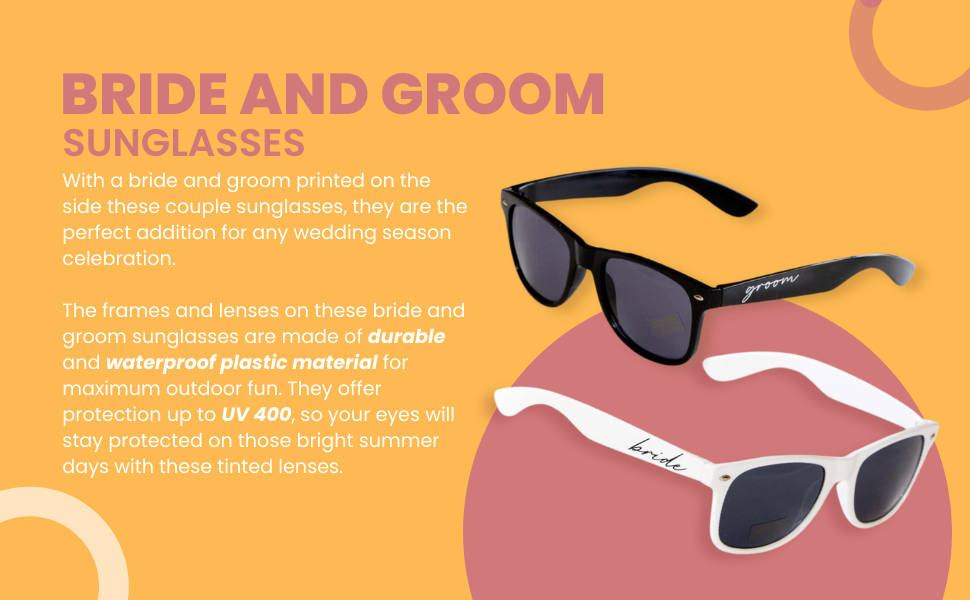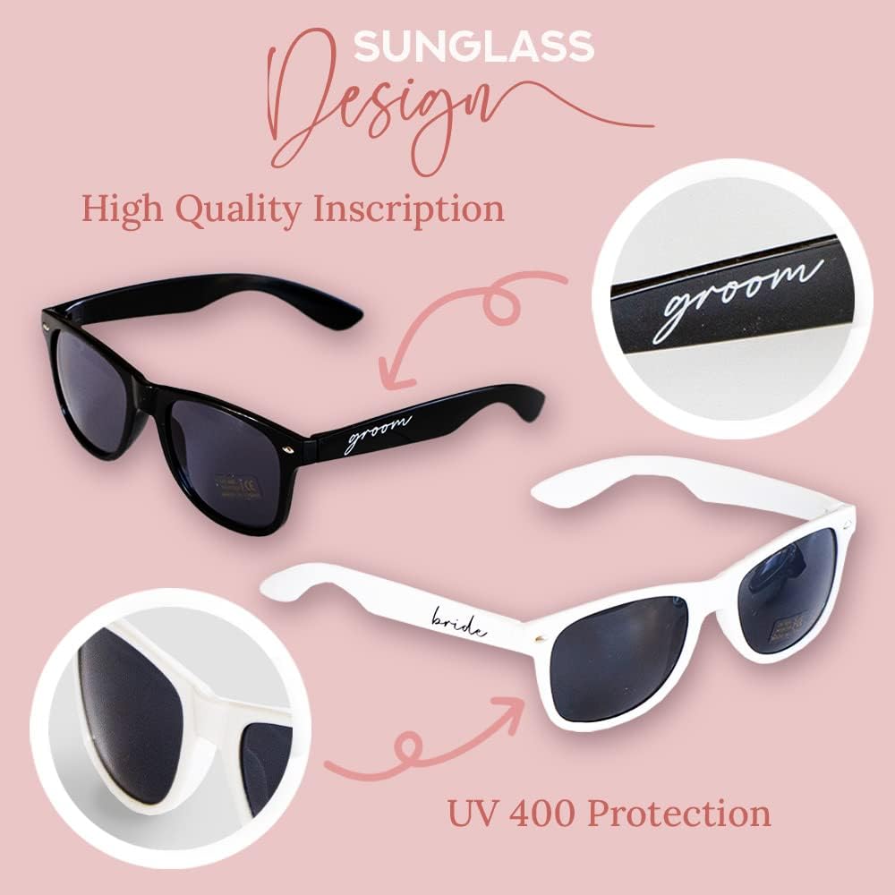 MEMORABLE MOMENTS: Capture every smile, kiss, and dance with sunglasses that symbolize your love, creating unforgettable moments on your wedding day, bachelor party and honeymoon. Perfect for wedding party gifts and bachelorette gifts for the bride.
