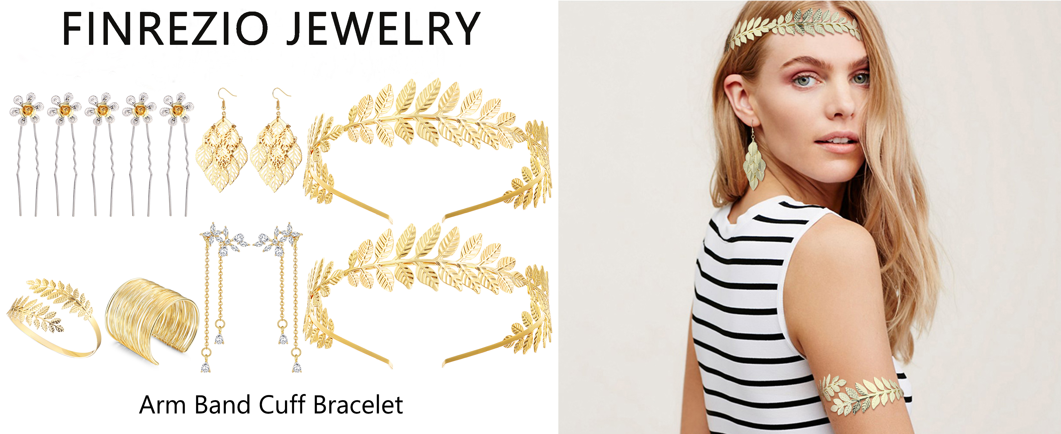 مجموعة إكسسوارات أزياء الآلهة اليونانية من FINREZIO للنساء، عصابة رأس على شكل أوراق شجر، سوار على شكل أوراق الغار الذهبي، تاج اصطناعي، أقراط متدلية لحفلات الزفاف، مجوهرات توغا