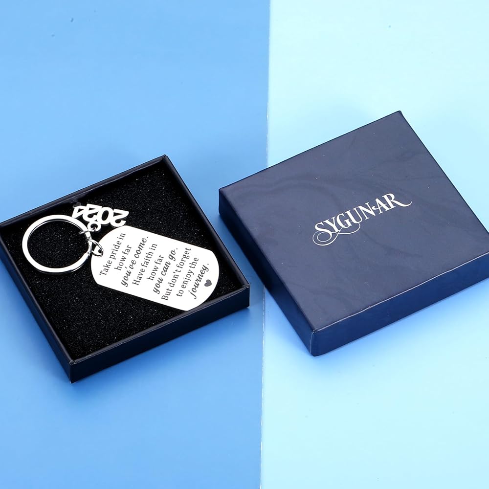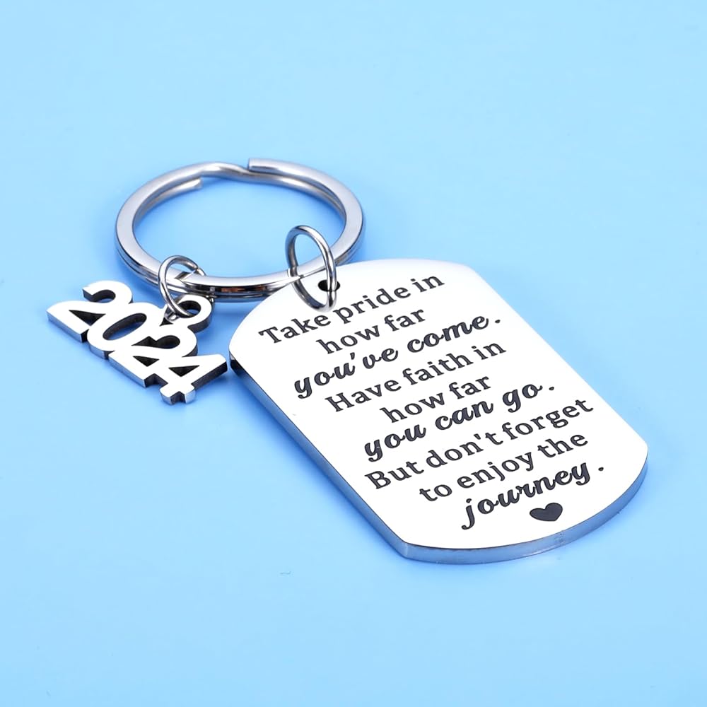 Stainless Steel Keychain: This graduation keychain is made of stainless steel material with deep engravings and strong ink, so the text will always remain clear, even with daily wear and tear. The keychain comes in a gift box, a wonderful graduation keepsake for graduation 2024.