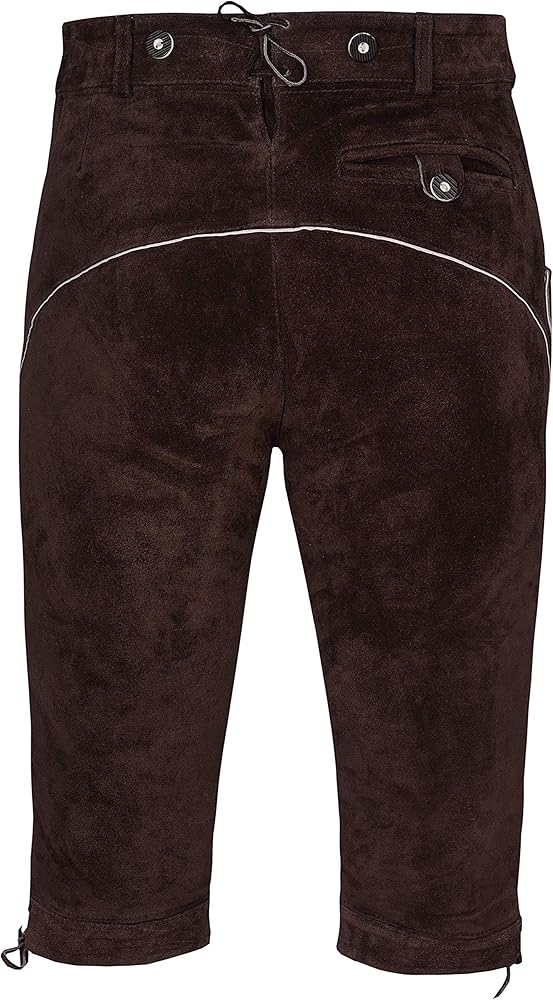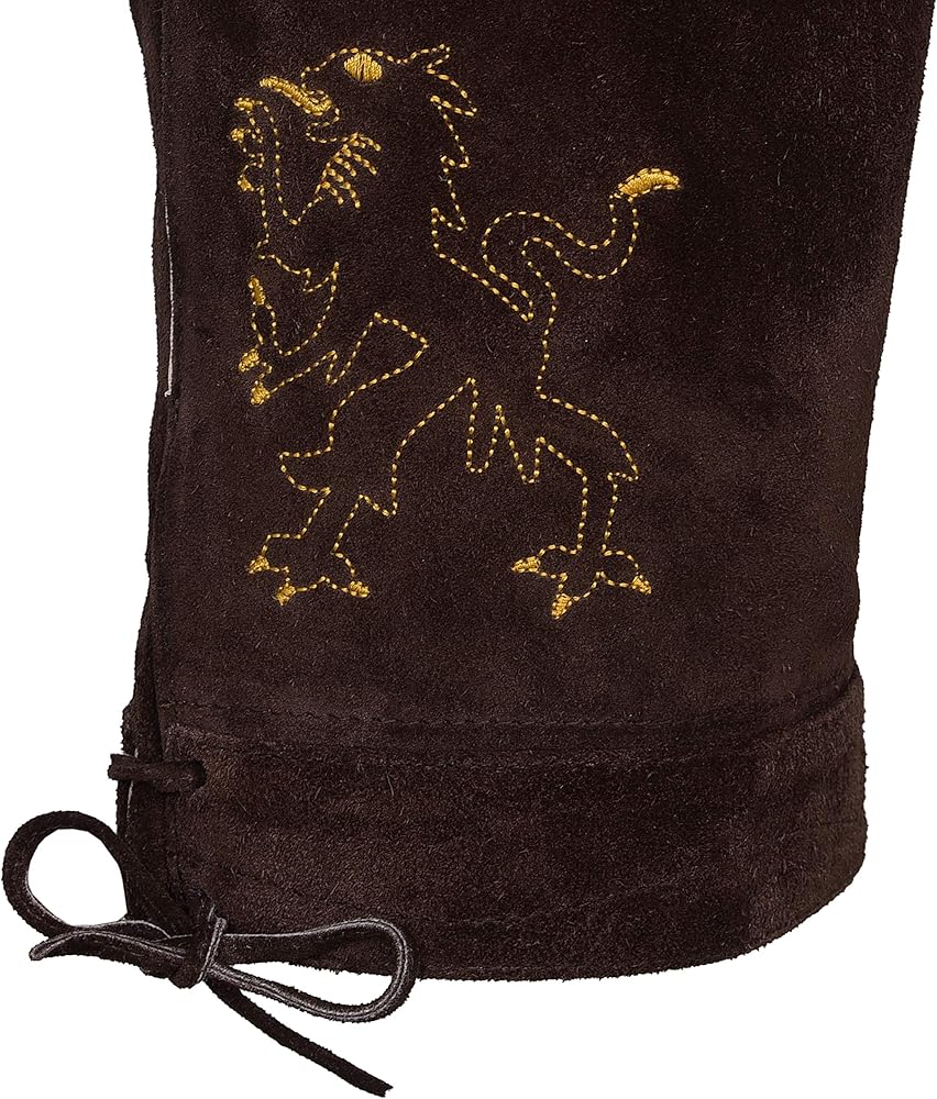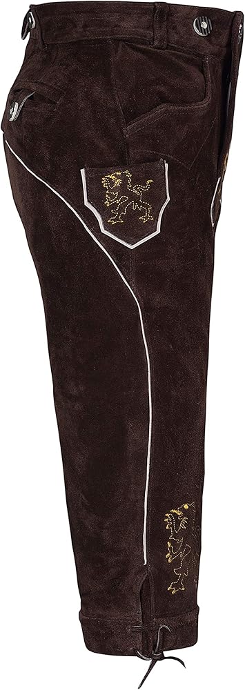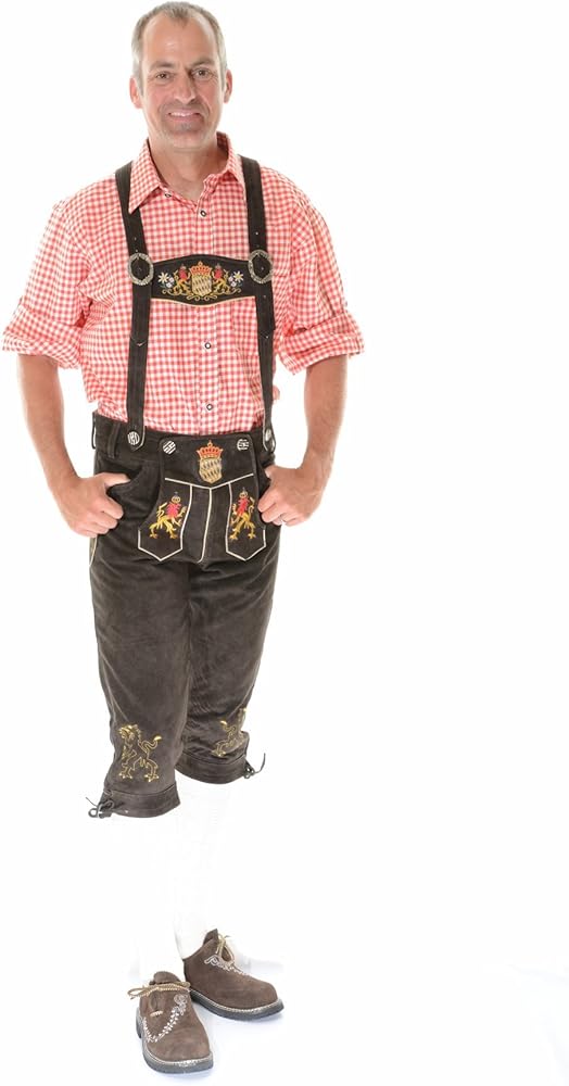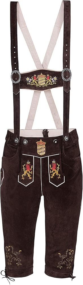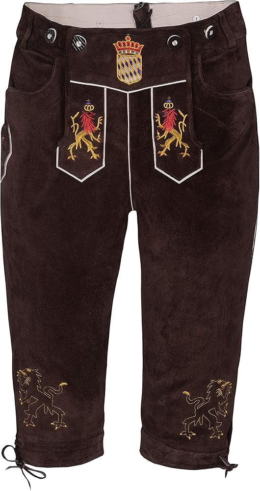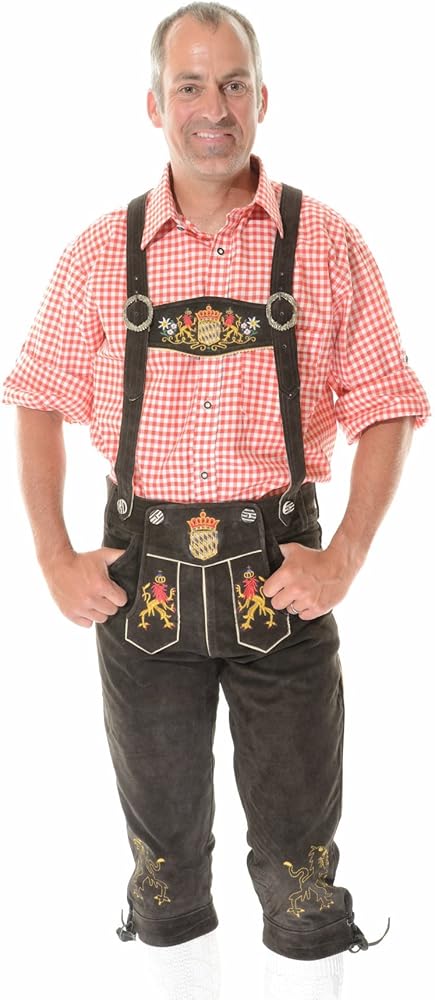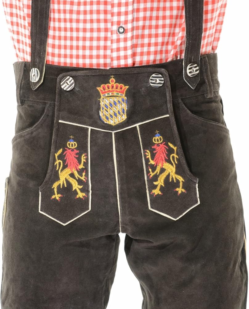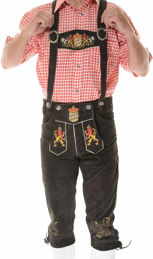 Nothing says “royalty” like the BAYERN lederhosen. This elegant dark brown suede leather trachten is also known as a Kniebund lederhosen (or knickers), which means it stretches below the knee. Whether you want to shine at Oktoberfest or simply own a unique and regal outfit, the BAYERN lederhosen is for you. Matching suspenders accentuate this German lederhosen tracht. Dazzling multicolored embroidery complement the look of this authentic national costume. The Hosenlatz, or the front flap, displays two Bavarian lions holding up the Bavarian emblem. Decorative lion stitching is also featured on both legs. Get your Bayern lederhosen today. For the best fit, our lederhosen outfits are displayed in actual inches, measured around the inside of the waist band. Once you know the size of the jeans and pants you wear at home, this is the size you will need to order. Our lederhosen are sized/ tagged in actual inches, measured around the inside of the waist band. Please take the measurement of your jeans or pants at home (around the inside waist band) to see with how many inches those come up and that is basically the size you want to order your lederhosen in from us. The leather of the lederhosen also stretches a little bit after a few times of wearing. In the back of the waist band are those straps (like shoe laces) to fine tune the fit. You can loosen and tighten them around an inch. If you are unsure or in between sizes then our recommendation is to go rather one size up.