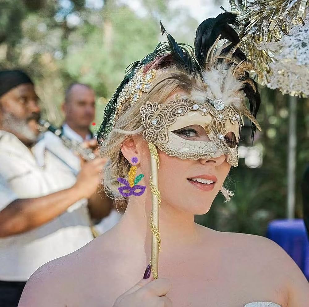 Mardi Gras means colorful parades,dancing,glittering costumes and extravagant balls.Purple,green and yellow,the traditional colors of Mardi Gras are said to represent justice,faith and power respectively.Our Mardi Gras earrings for women featuring acrylic mask earrings and mardi gras tassel earrings in our festive purple green and yellow colors. Party your heart out with while wearing these fun Mardi Gras earrings!