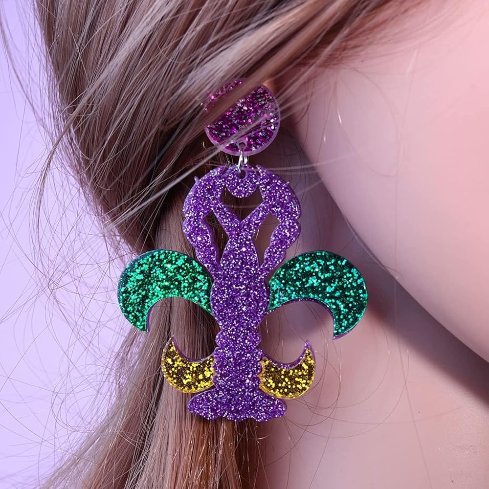 4 Pairs Mardi Gras Earrings for Women Carnival Parade Mask Lobster Modelling Earrings Set Fleur De Lis Earrings Acrylic Mardi Gars Jewelry for Fat Tuesday Celebrations Party