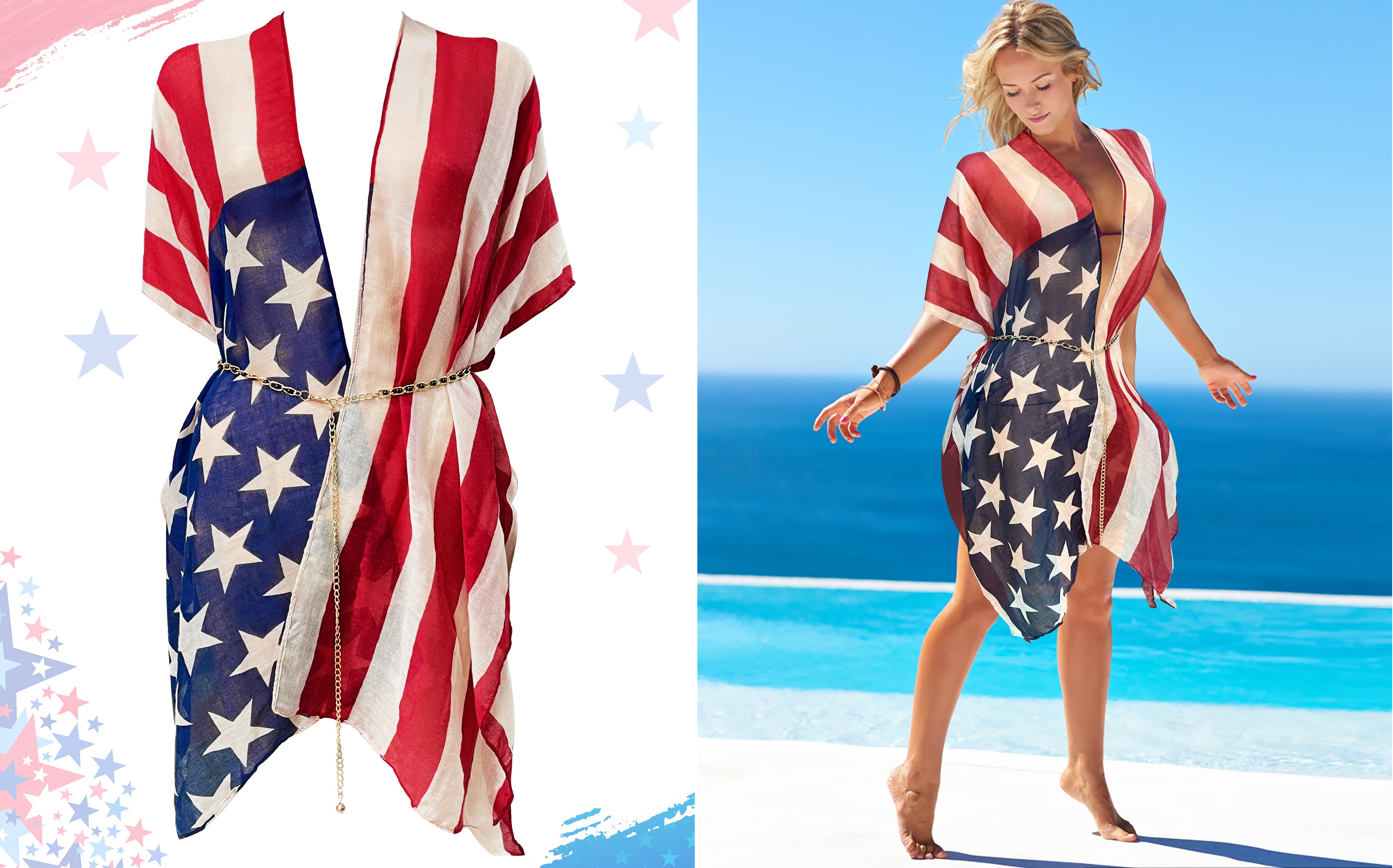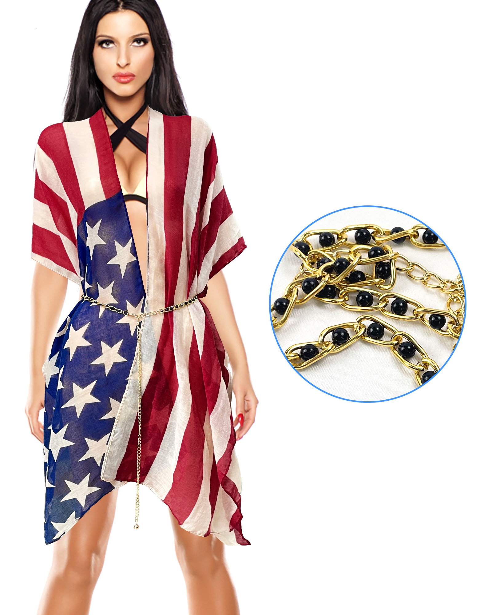 【What will You Get】You will a red blue beach cover up cardigan kimino match with a adjustable belt chain that is suitable for women girls beach activities, daily, prom, etc. The beach shawl is designed american flag print July 4th USA star stripe patriotic style,versatile and fashionable