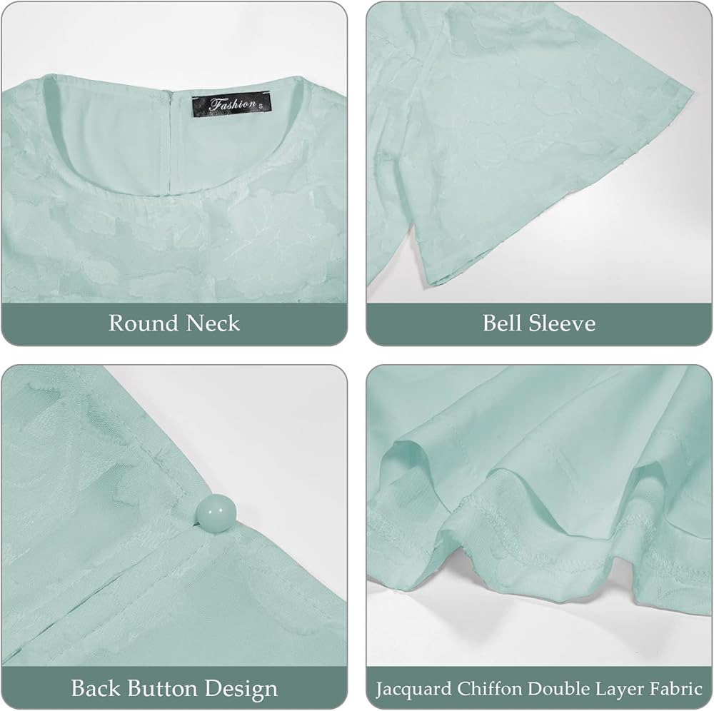 Highlight your elegance: Womens 3/4 bell sleeve summer tops adopt romantic floral textured fabric,round neck,solid color babydoll blouses for women,featured with the unique lace patchwork tiered design of long lantern sleeves that ensures a good fit will give you a charming look.