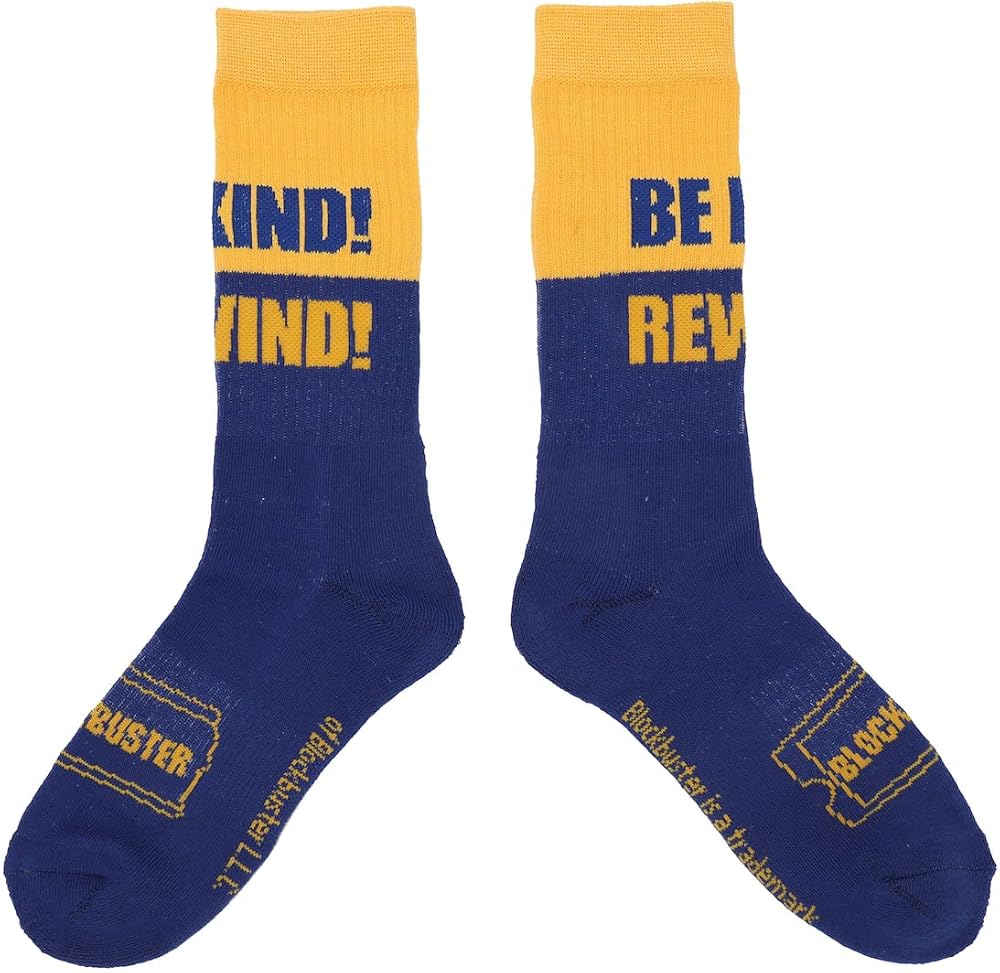CUSTOM DESIGN: Step into a bygone era with these custom designed Blockbuster crew socks. They proudly showcase the classic Blockbuster logo and the iconic "Be Kind, Rewind" message in bold blue and yellow letters.